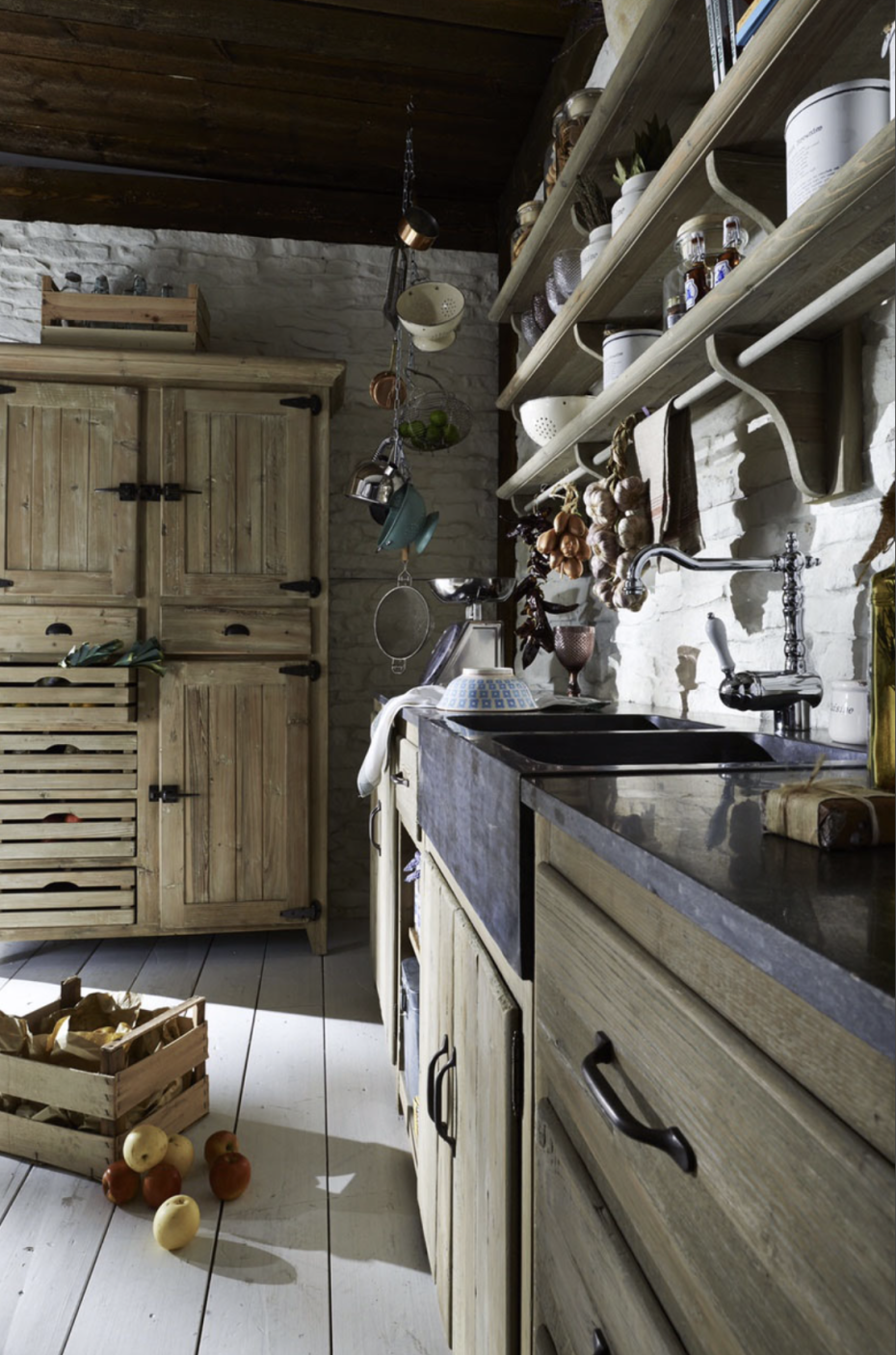 Landelijke stijl keukenbarkast gemaakt van oud grenen. Deze keukenkast voor het opbergen van proviand beschikt over 3 oud grenen deuren en 2 schuiven en 4 laden (uitneembaar).