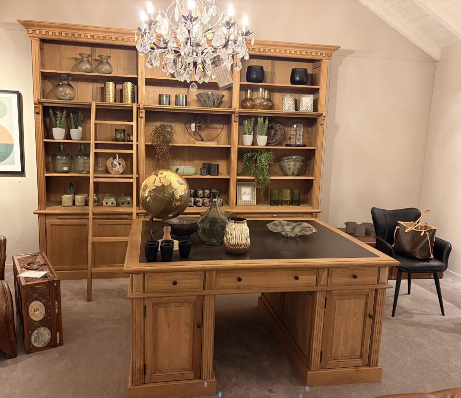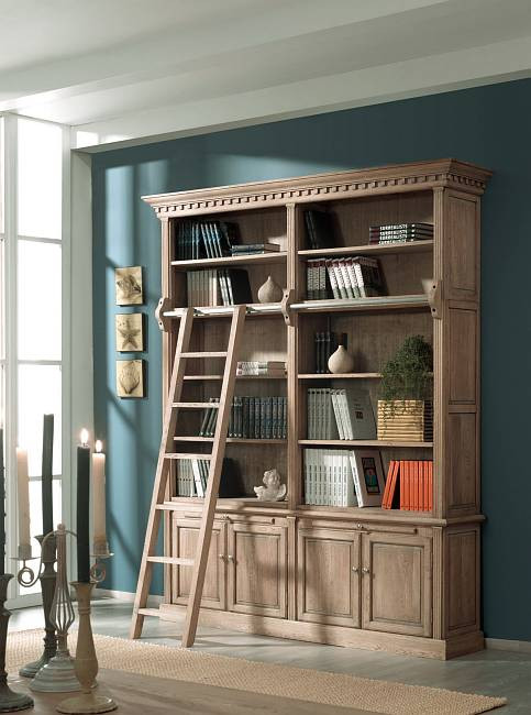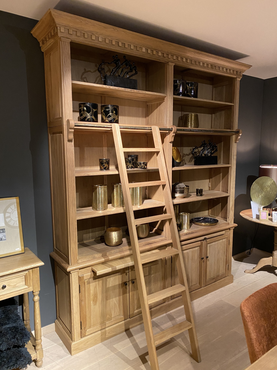 Ce meuble bibliothèque classique authentique en chêne massif avec échelle s'intègre parfaitement dans un intérieur campagne.
