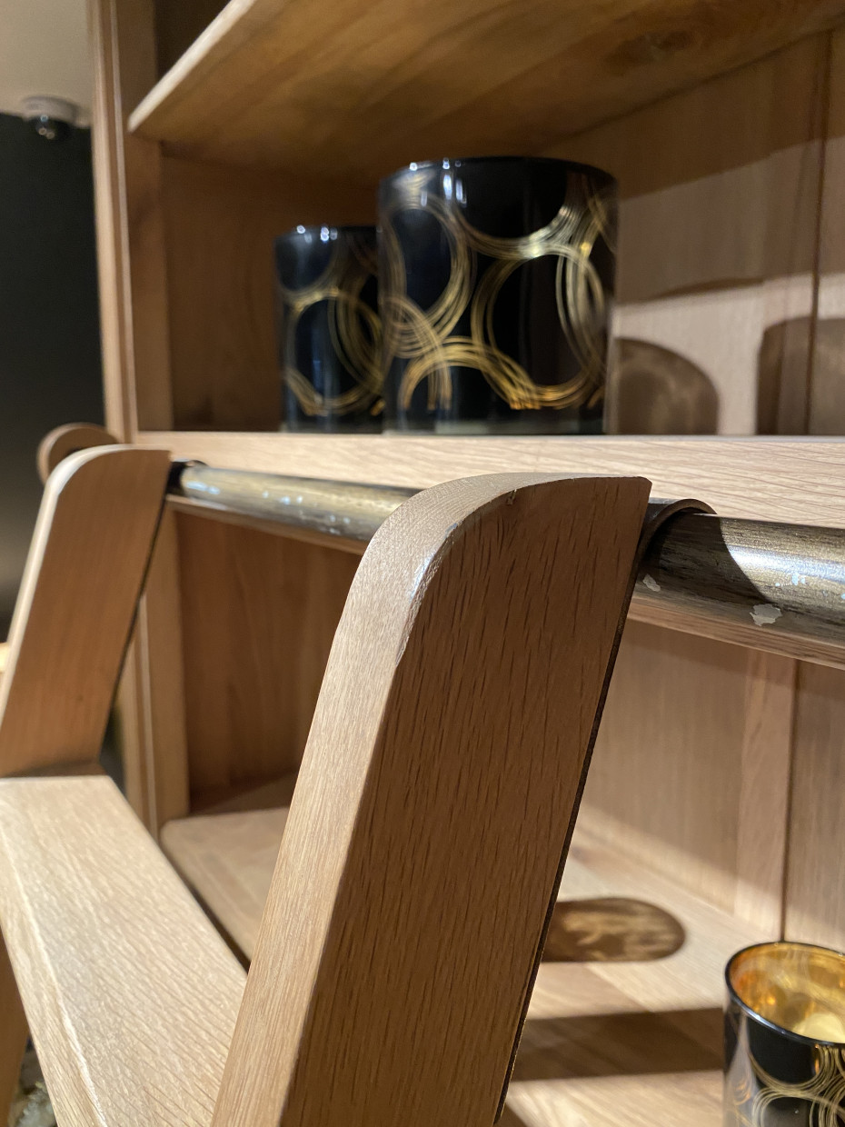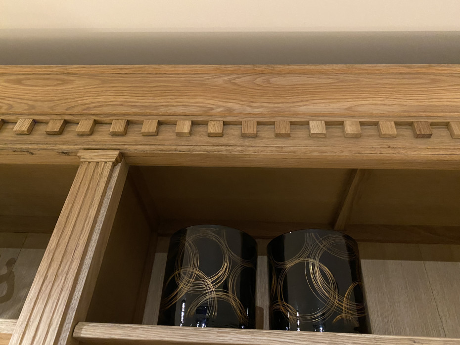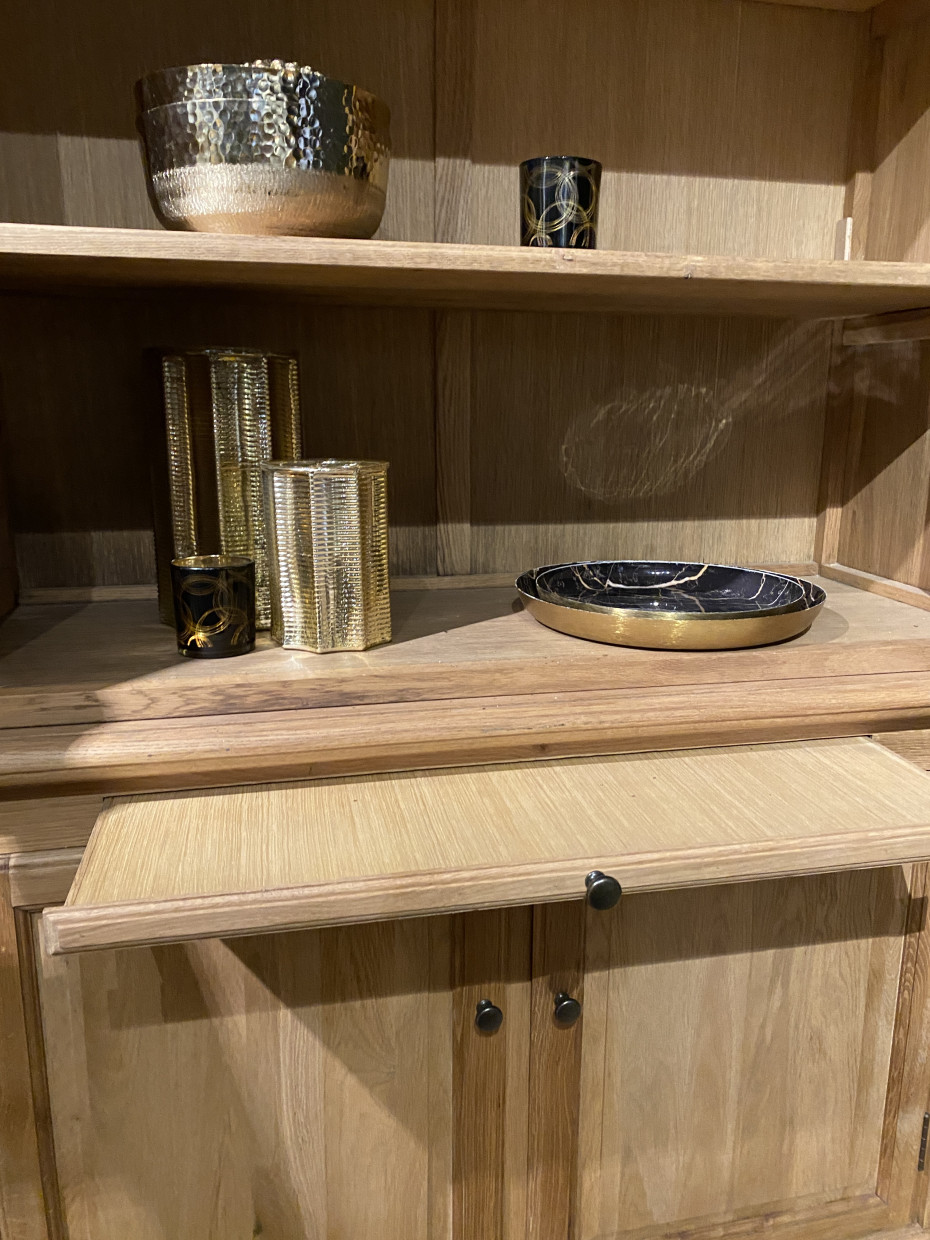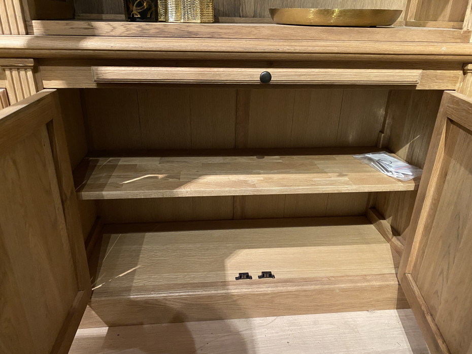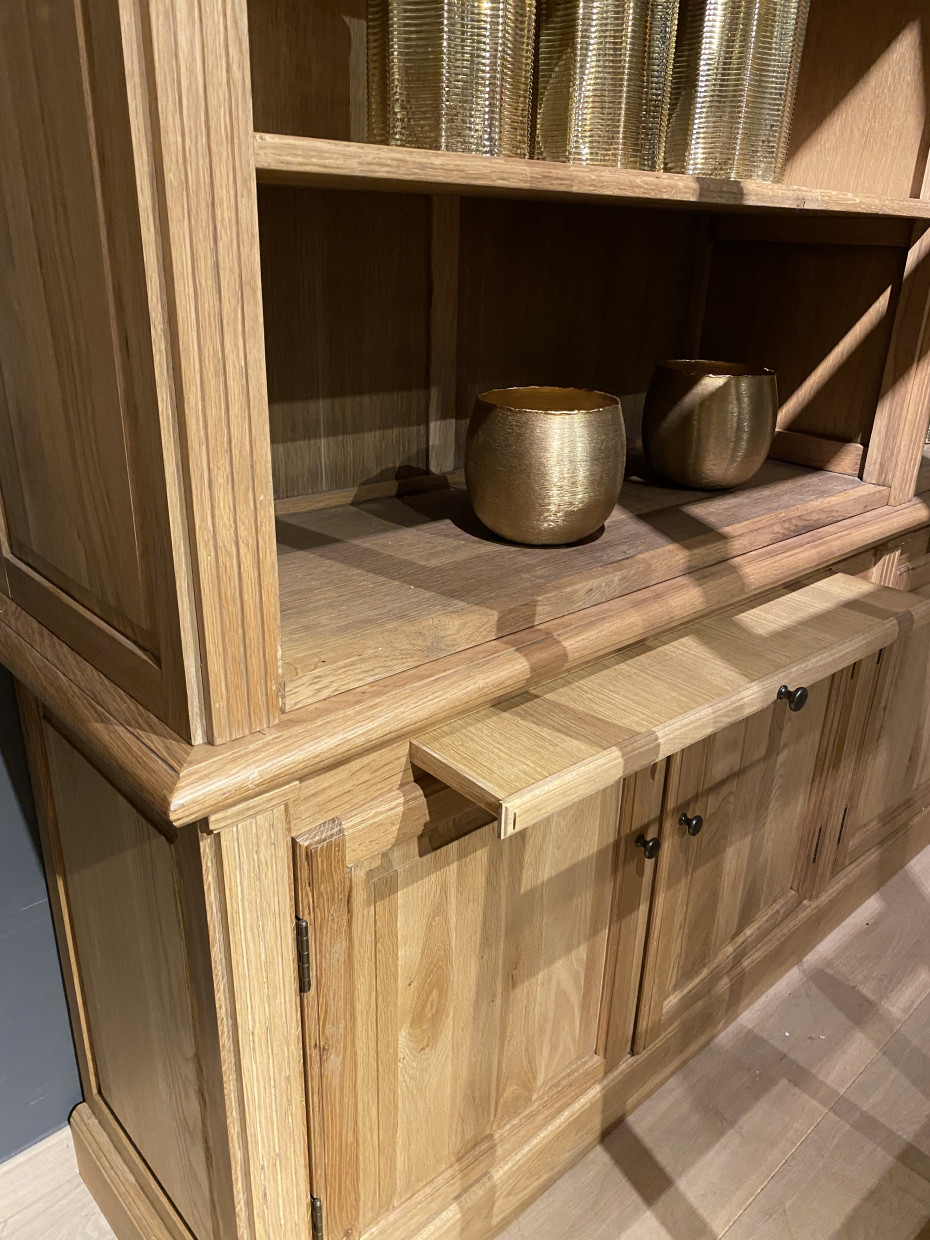 Bibliothèque en chêne avec 4 étagères et 4 portes en chêne massif, derrière lesquelles une autre étagère.