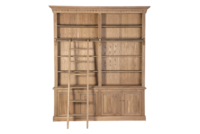 Bibliothèque classique en chêne avec échelle et barre coulissante. Cette bibliothèque de style campagnard est très spacieuse et robuste pour donner à tous vos livres une place permanente.
