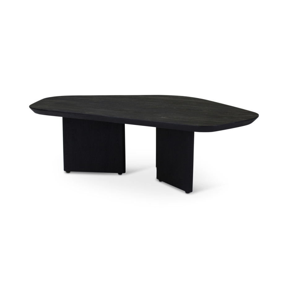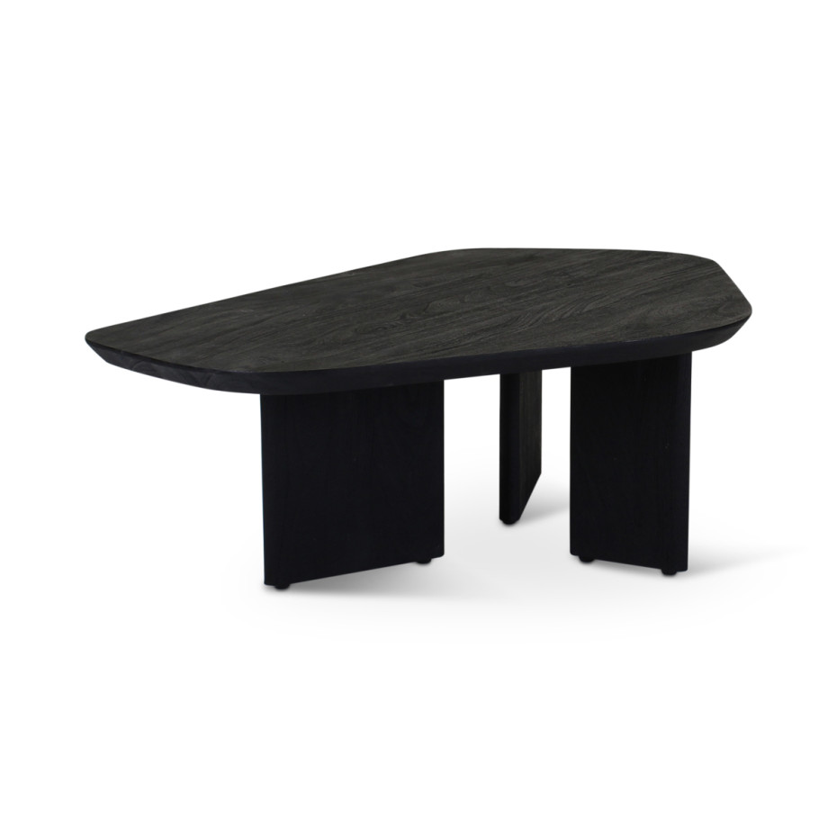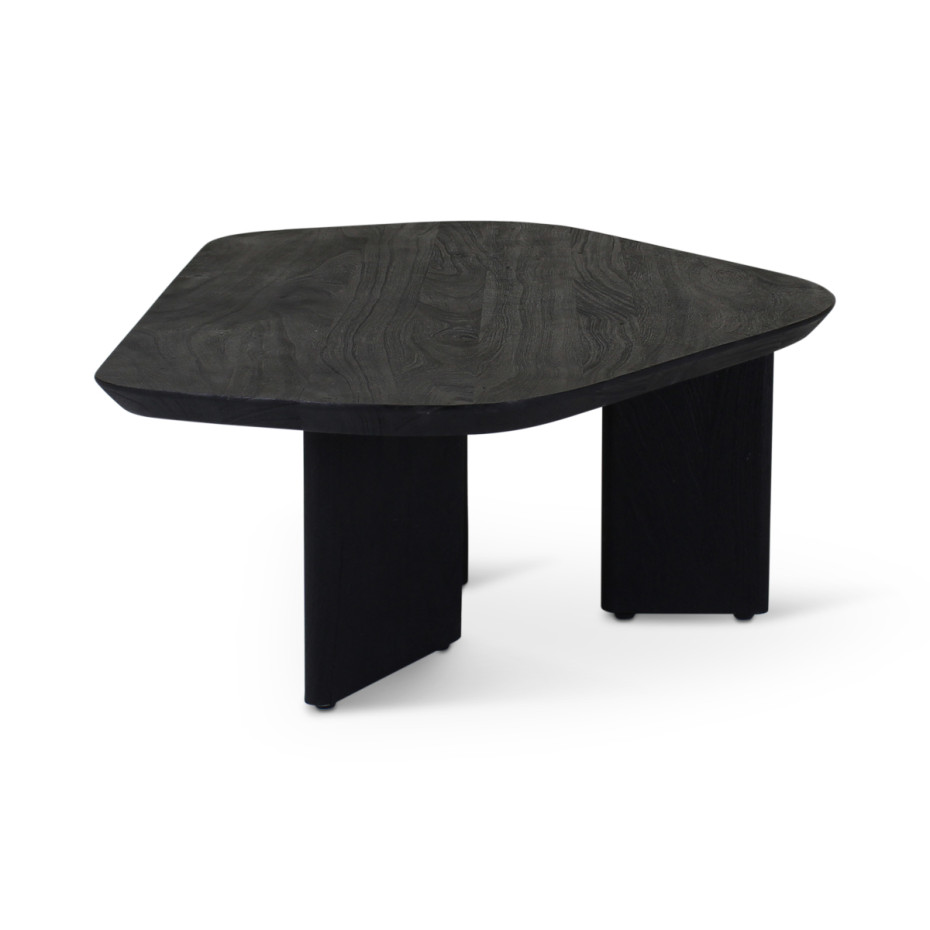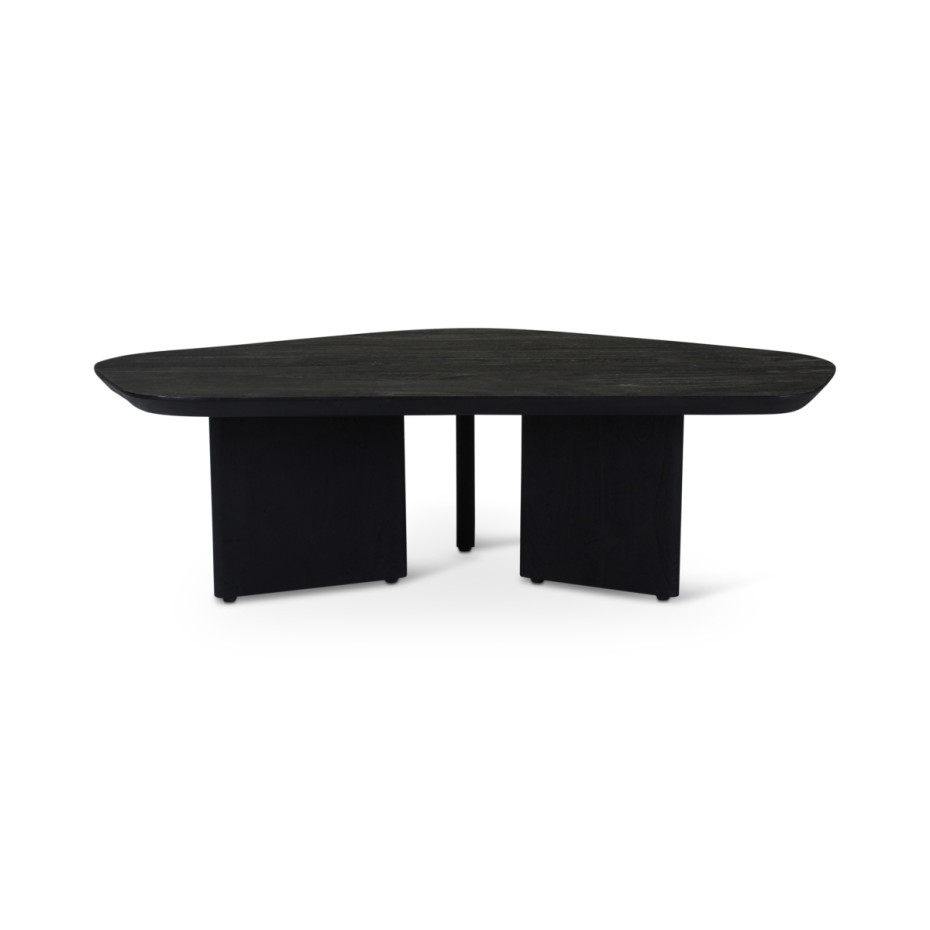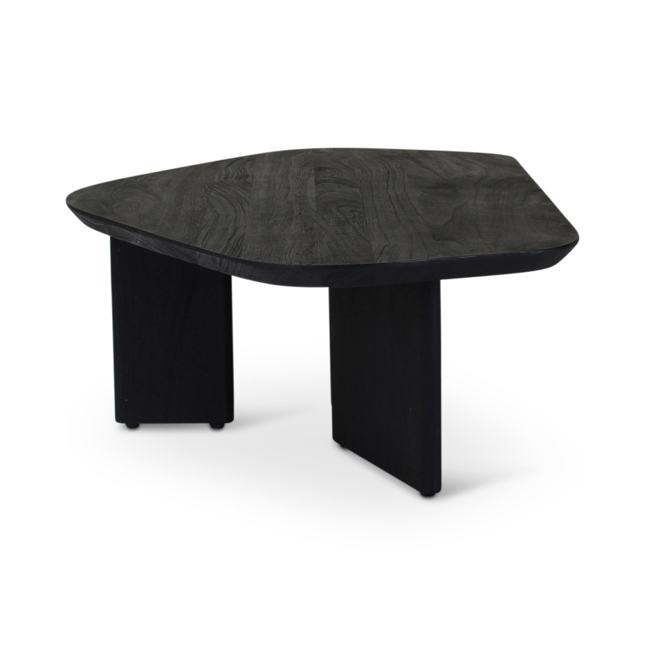 La table de salon Kato a 3 pieds de table et un plateau triangulaire organique avec bord biseauté
