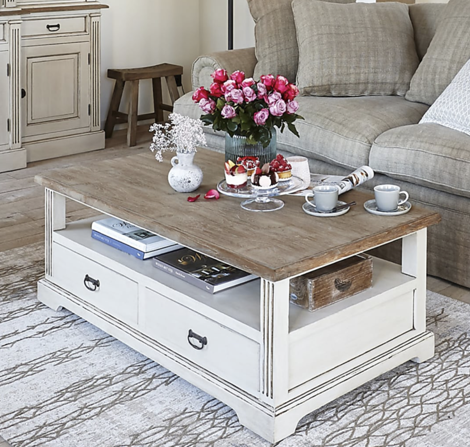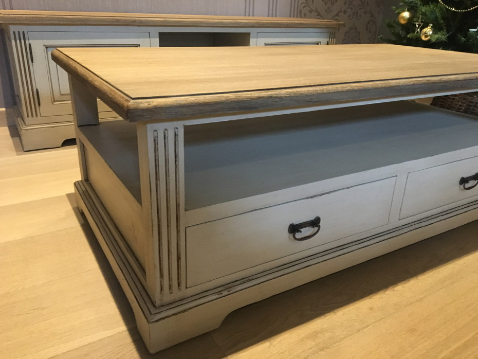 Table basse de style champêtre de couleur crème avec 4 tiroirs avec un plateau pratique au-dessus. Table basse country avec de beaux détails, poignées rétro en laiton et moulures. Cette table basse crème est faite de bois et de couleur crème et fini avec un top en teck naturel qui ajoute un charme supplémentaire à la table basse