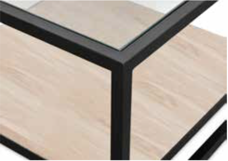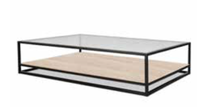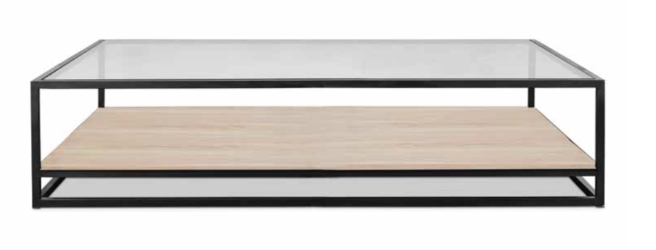 Table basse moderne composée d'un cadre en acier noir, d'un plateau en verre transparent et, en plus, d'une étagère en chêne donnant le nom duo à cette table basse