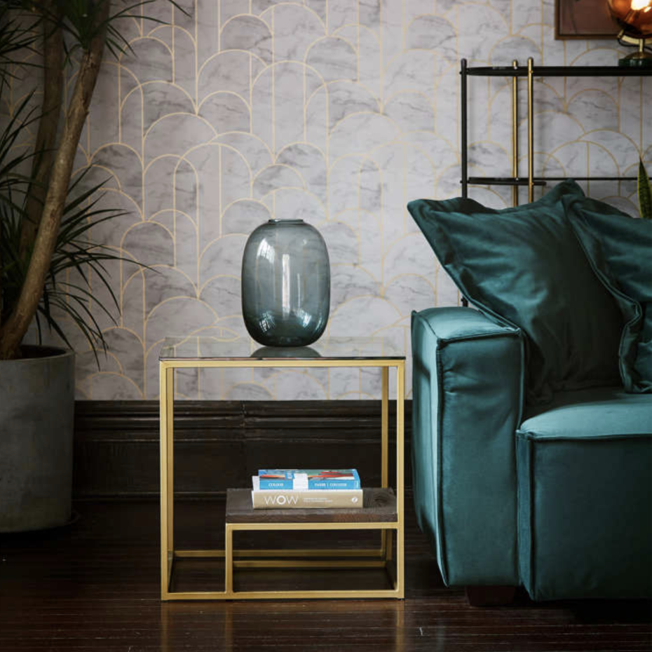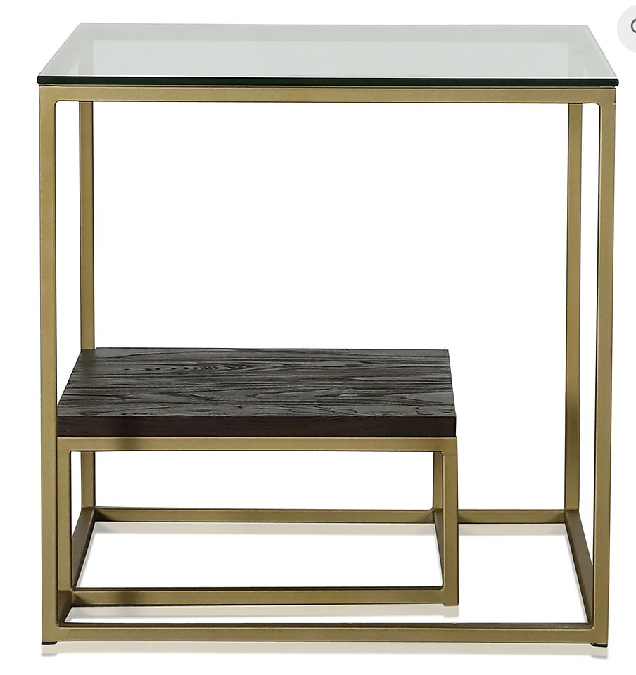Les tables d'appoint PR LIVING ont un design vintage moderne. La table d'appoint Forli de PR Living a un plateau en verre et une étagère en chêne dans une structure en métal