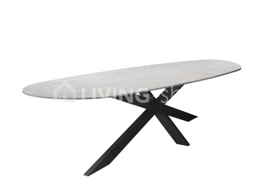 Envie d'une magnifique table de salle à manger en céramique qui attire tous les regards ? La table Asta possède un plateau ovale en céramique et un piètement croisé en métal noir.