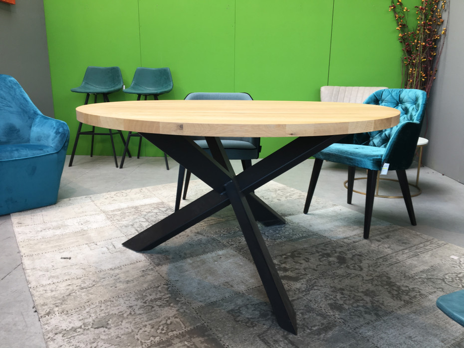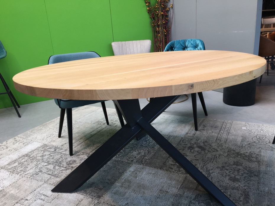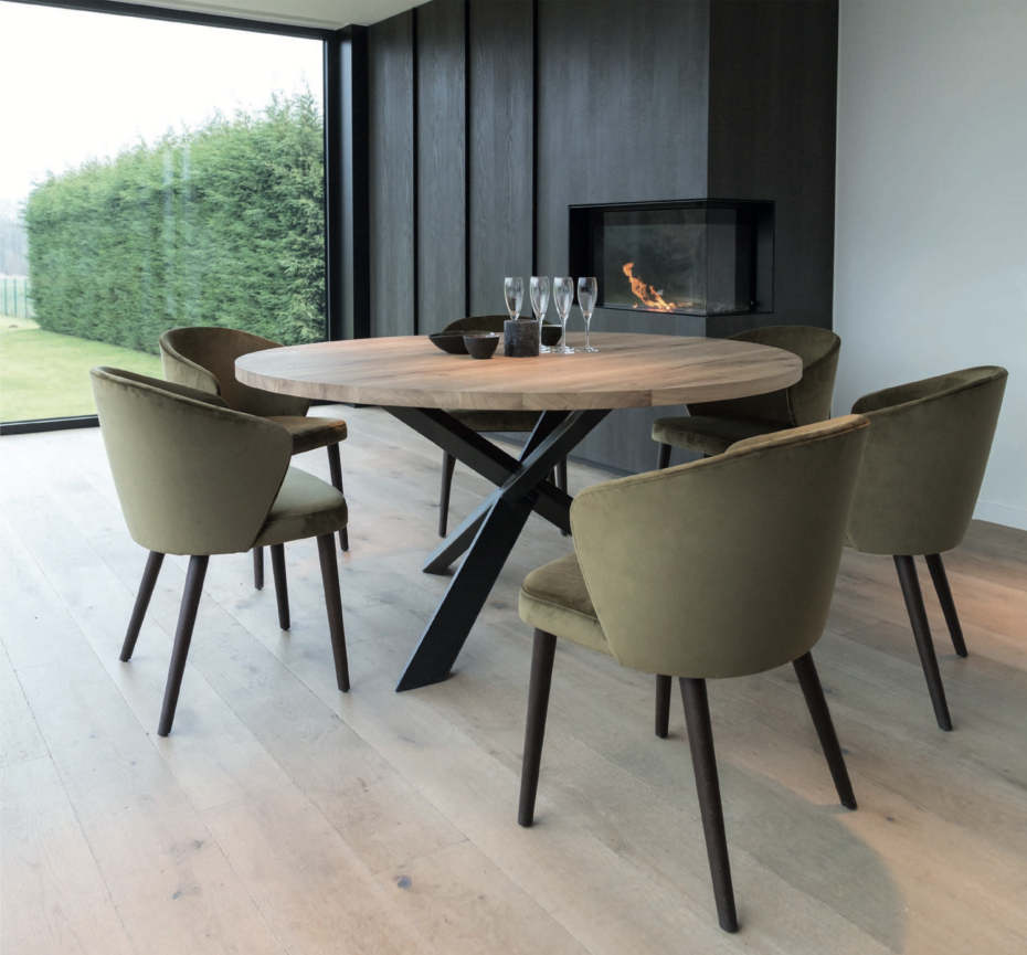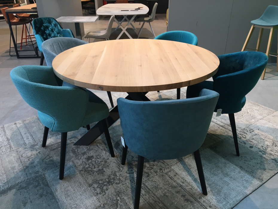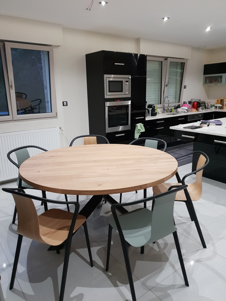 Vous pouvez choisir la couleur de chêne pour le plateau de votre table à manger ronde (entre 7 coloris!) avec la jambe croisée en métal noir.