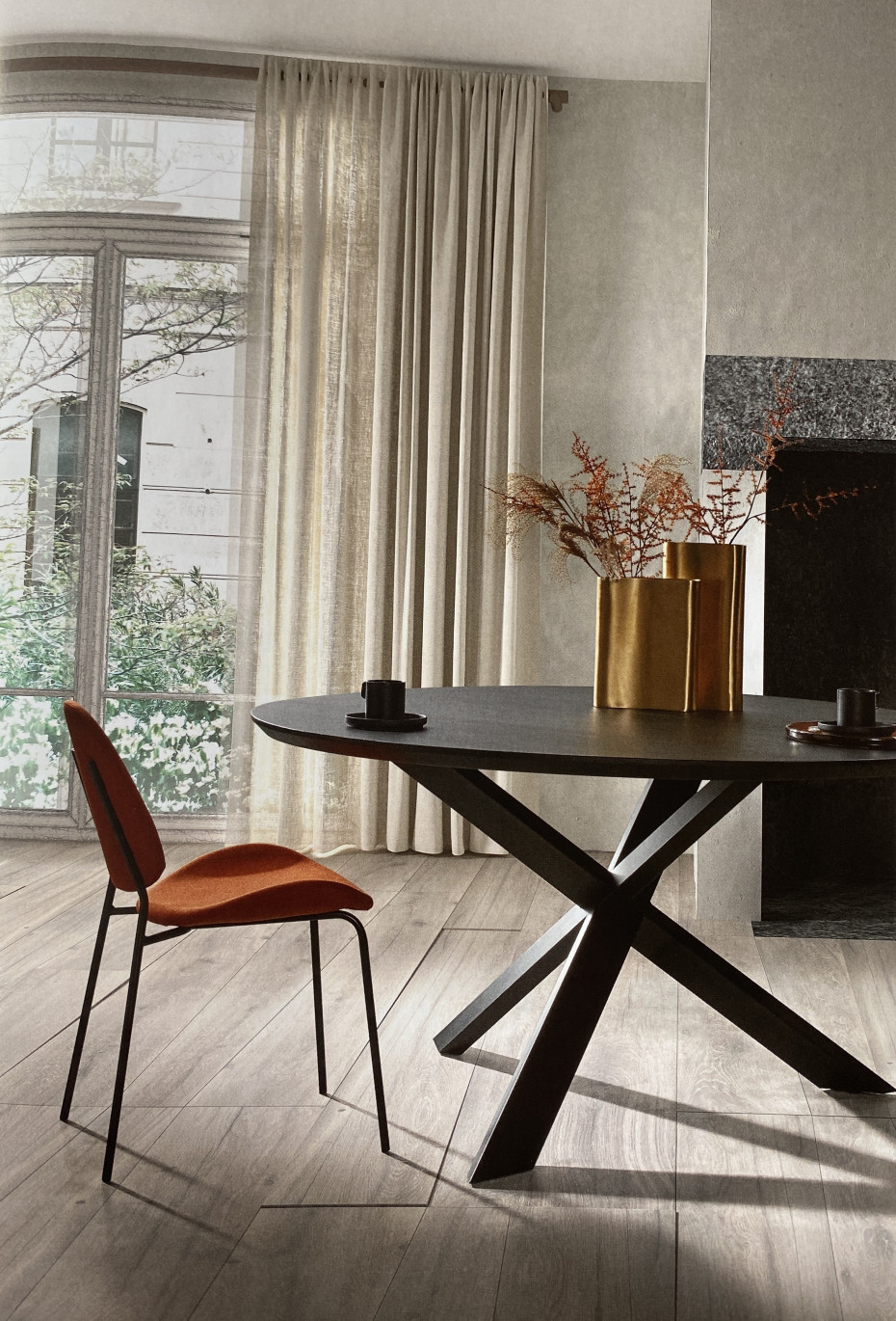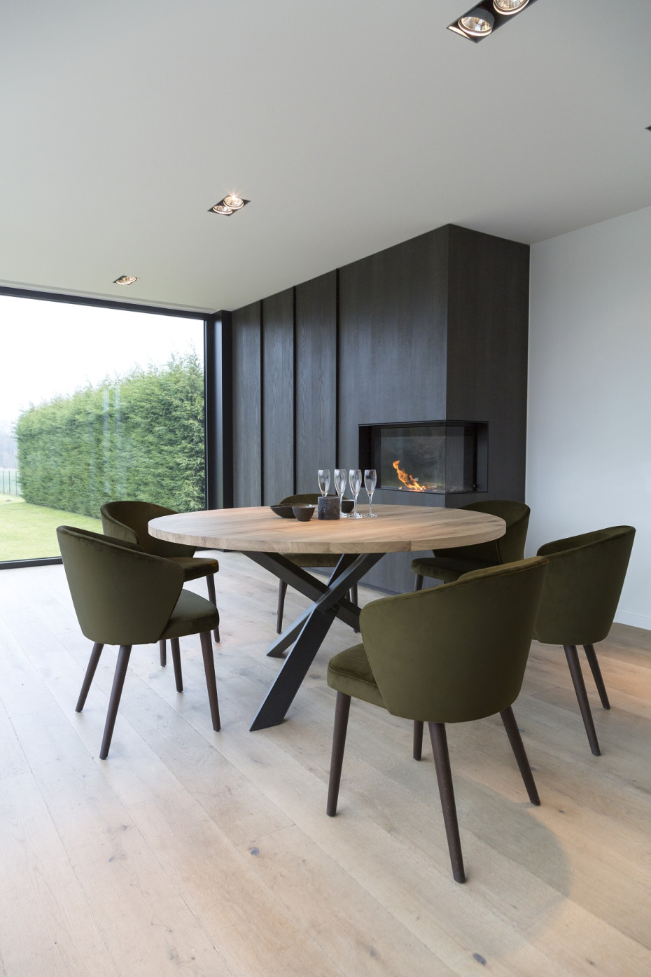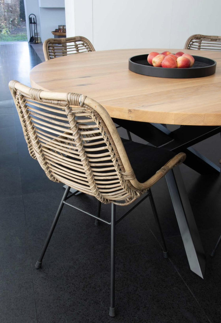 Vous pouvez choisir la couleur de chêne pour le plateau de votre table à manger ronde (entre 7 coloris!) avec la jambe croisée en métal noir.
