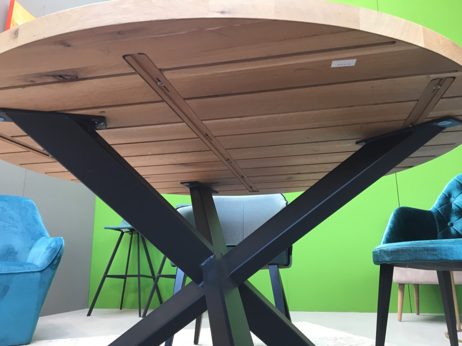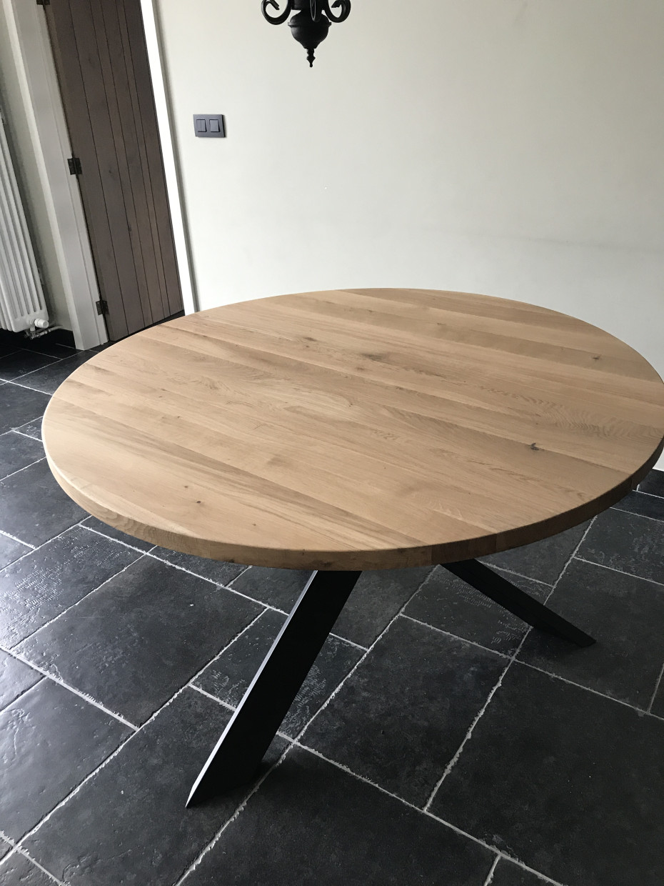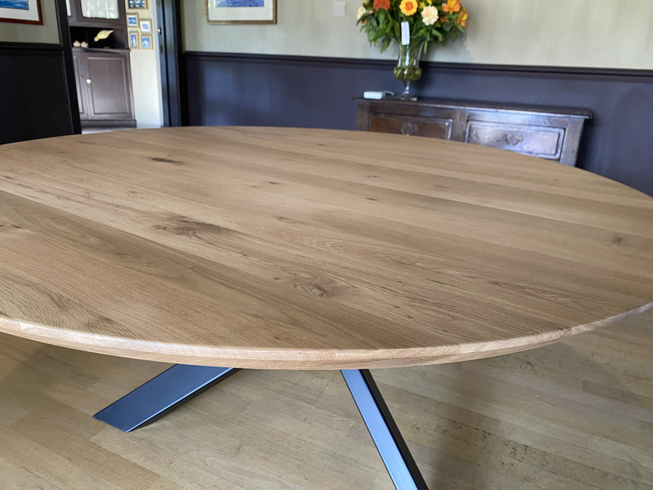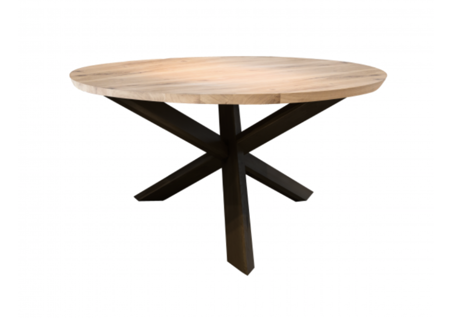 Table à manger ronde en chêne à choisir le bord straight ou beveled avec patte croisée; avec un pied croisé en métal.