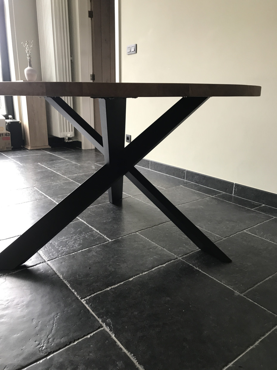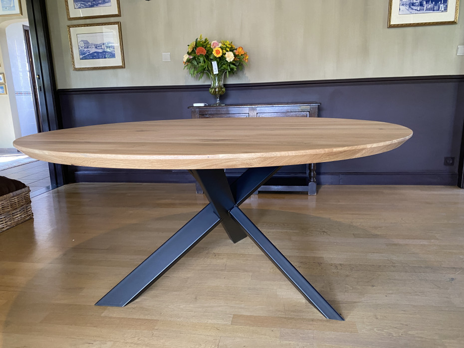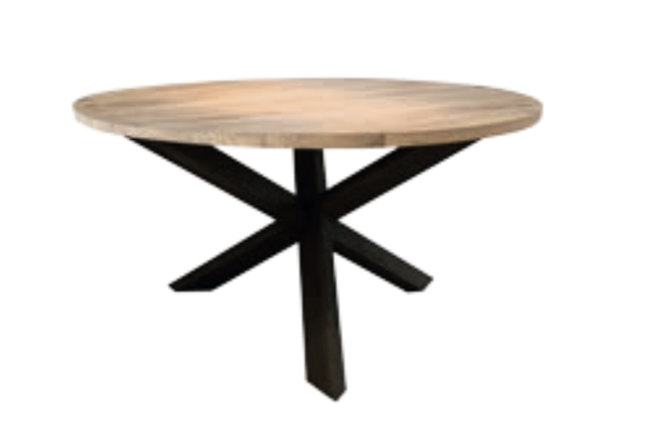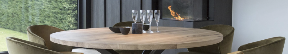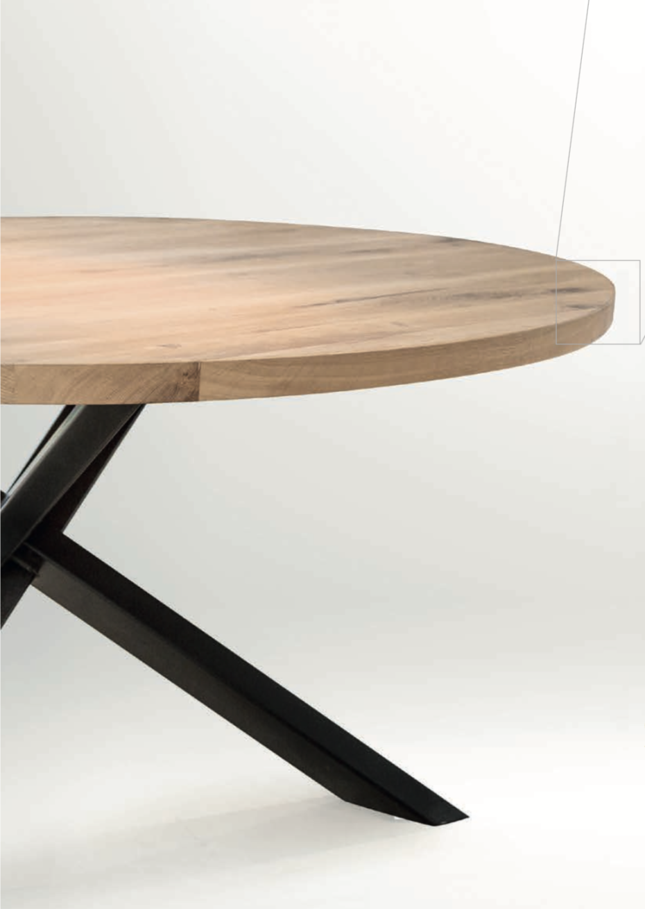 Table à manger ronde en chêne à choisir le bord straight ou beveled avec patte croisée; avec un pied croisé en métal.