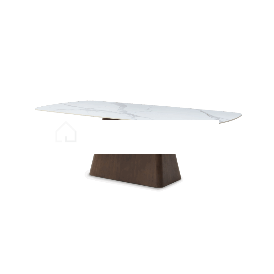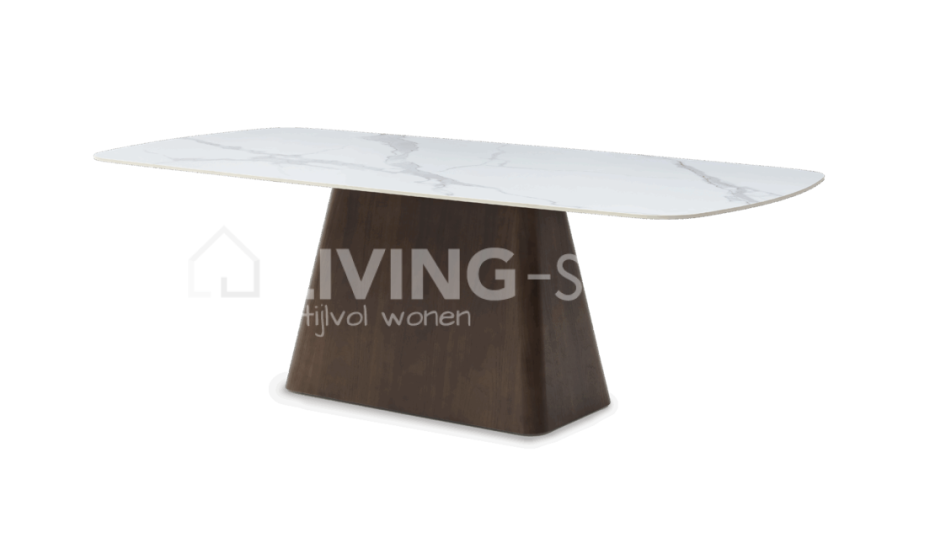 Cette table ovale danoise en céramique est disponible avec un plateau en céramique imitation marbre blanc-gris ou blanc doré.