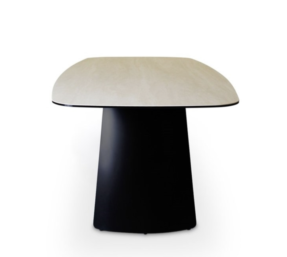 Table TIBET 240 x 110 cm, céramique effet travertin clair, piètement en métal noir