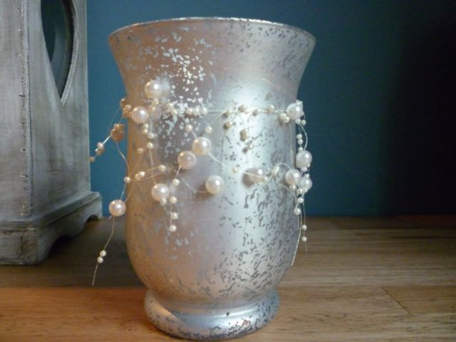 Lanterne en argent mat, orné d'une couronne de perles blanches.