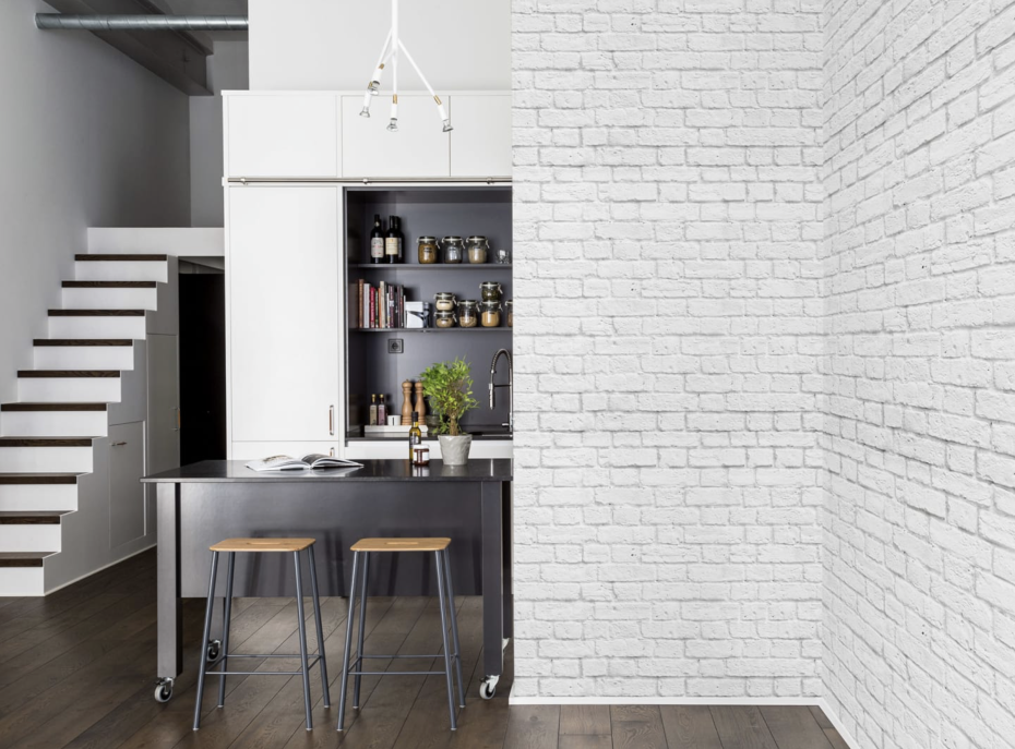 Ce papier peint Soft Bricks est un murale dans des tons blancs qui représentent un mur, aussi disponible en gris