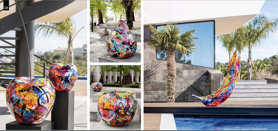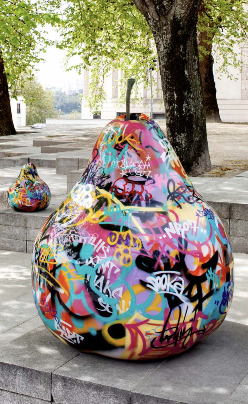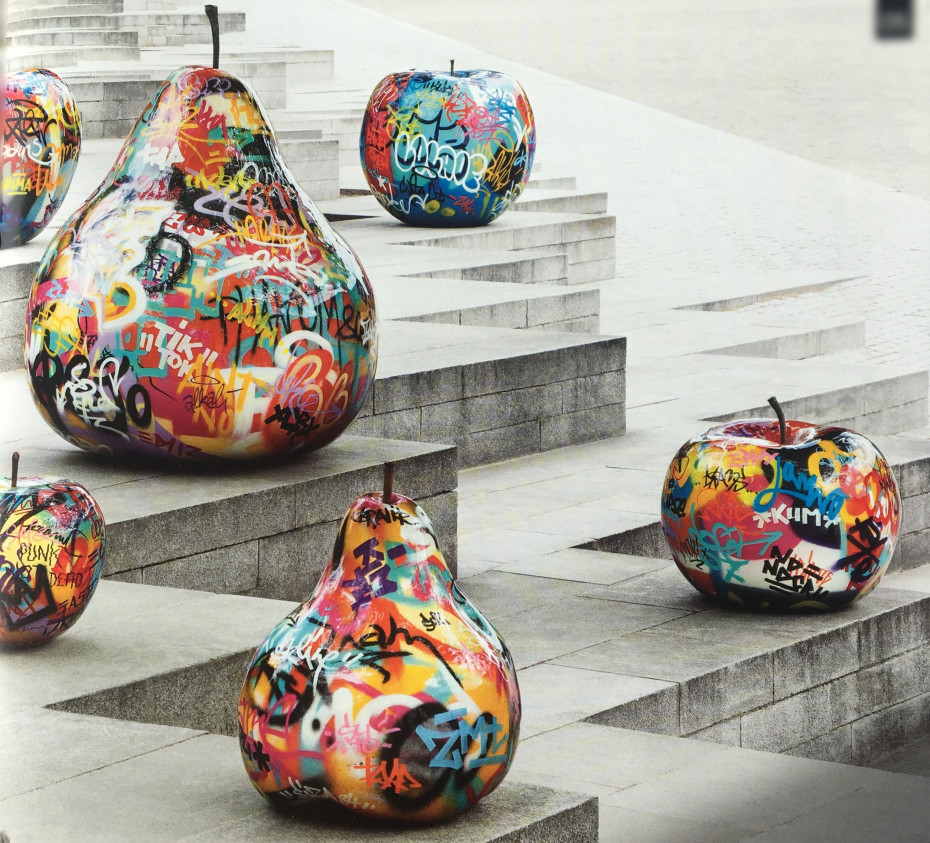 Deze decoratieve tuinbeelden appels en peren artist edition by Bruno zijn volledig rondom gespoten met kunst graffiti en gemaakt van polyresin, outdoor tuinbeelden die 100% kleurvast en vorstbestendig zijn.