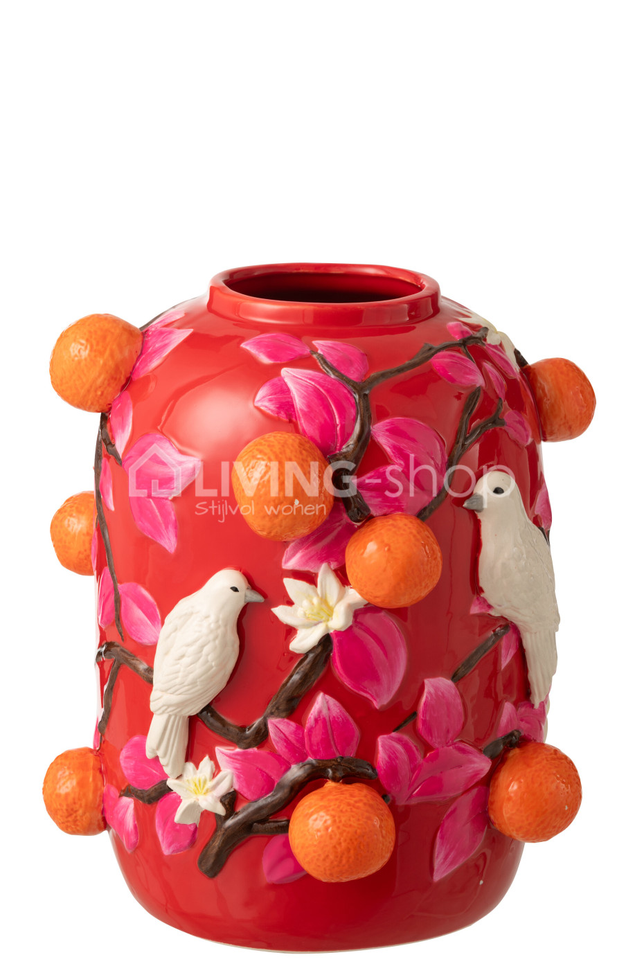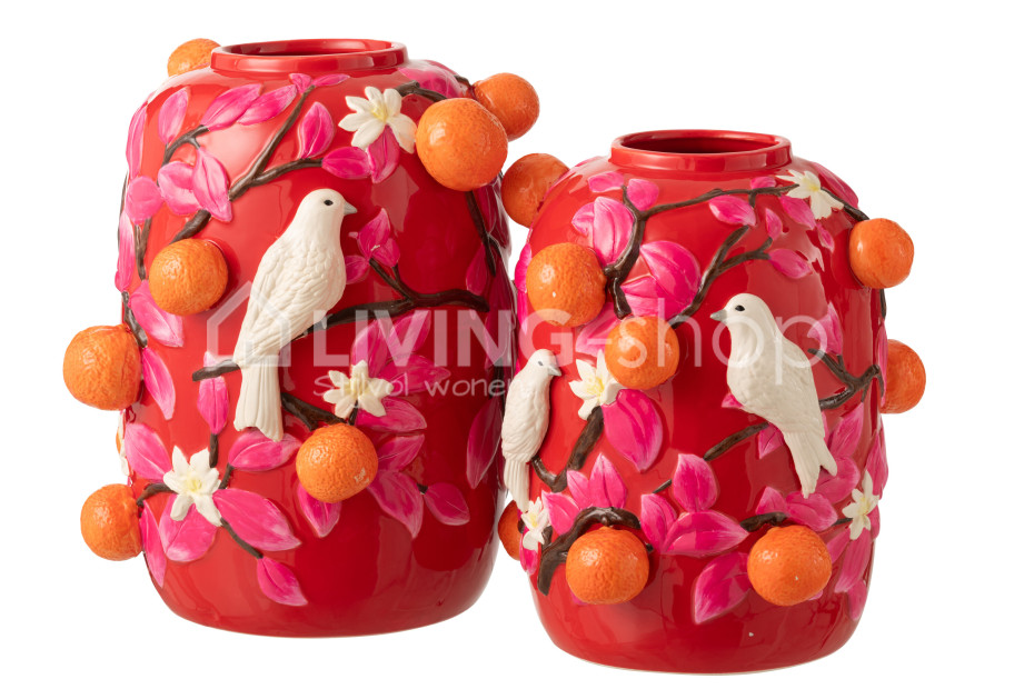 De J-LINE vaas is rond van model en gemaakt van keramiek, versierd met vogels takken en blaadjes en sinaasappels en sinaas bloesems