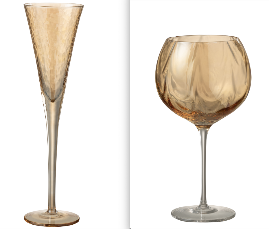 Mooie roze of amber of transparant gekleurde champagne en wijnglazen van J-Line.
