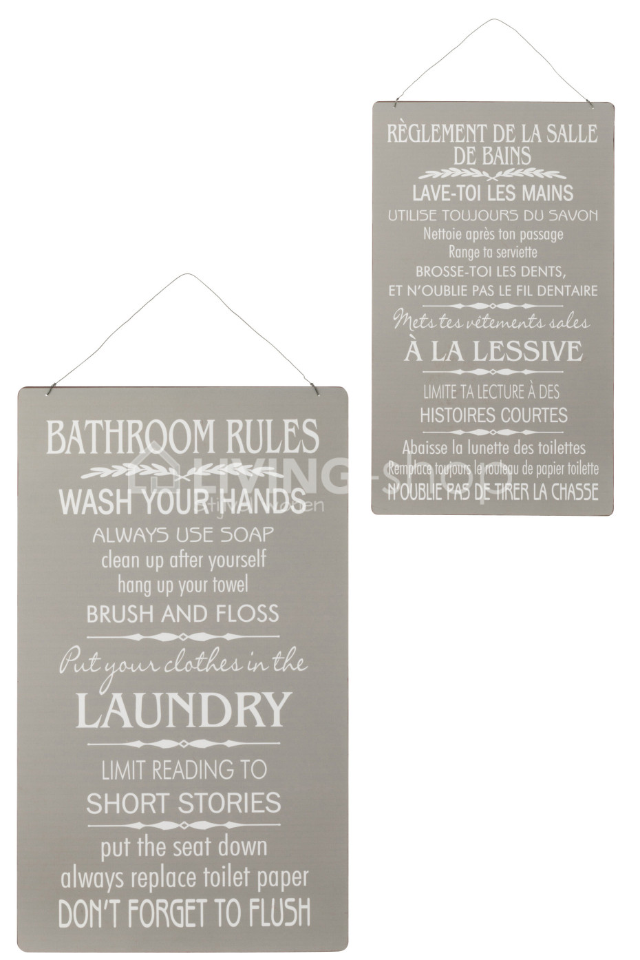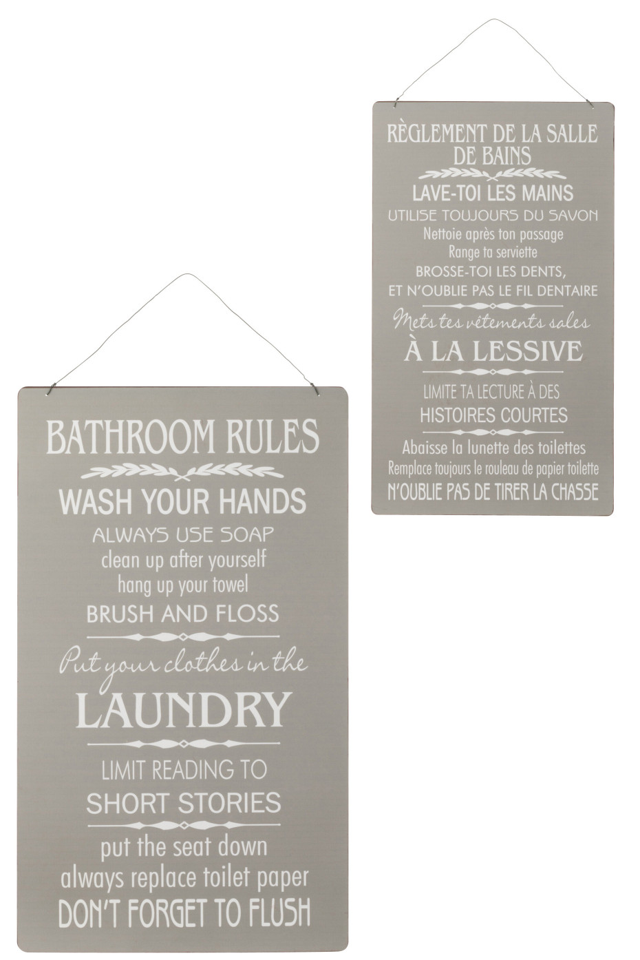 J-LINE Plakkaat assortiment van 2 aparte hangers met tekst Bathroom Rules - Règlement