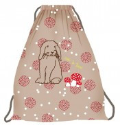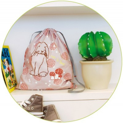 Leuke en stevige kinderzak welke kan dienst doen als Schoolzak en/of Zwemzak, met een schattig konijn en paddestoeltjes erop, Afmetingen : 32 x 36 cm Kleur: marron/bruin/roze Met trekkoord, 100% katoen, machine wasbaar. Gymzakken, schoolzakken van het hippe Parijse Merk Mimilou. Cadeautip !
