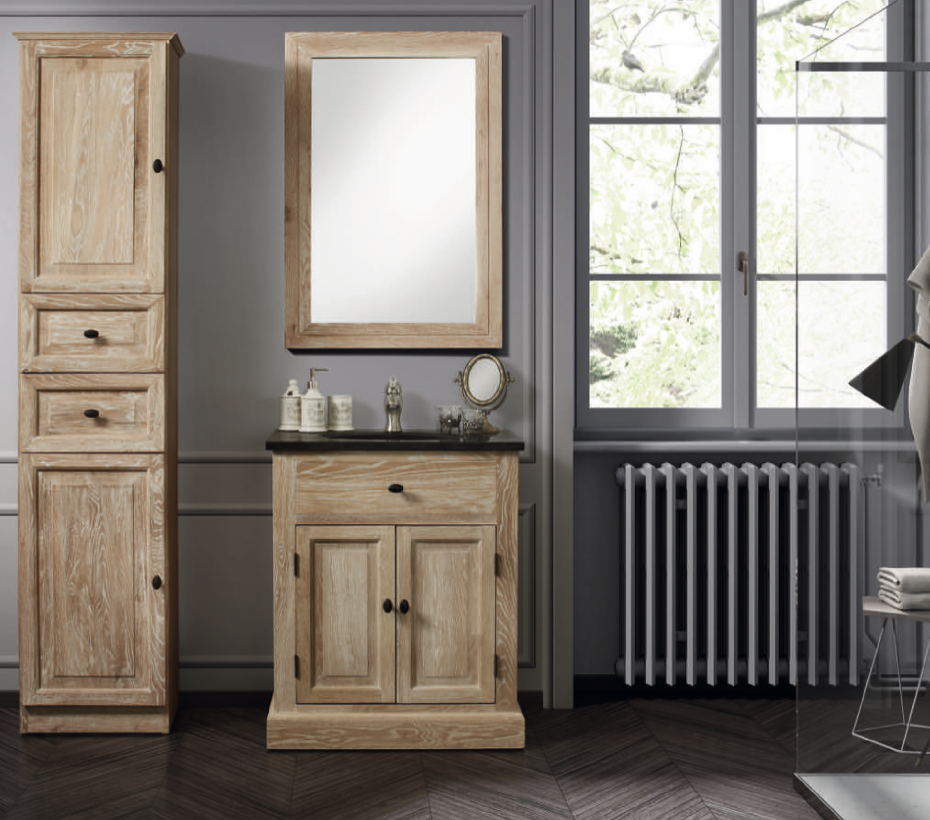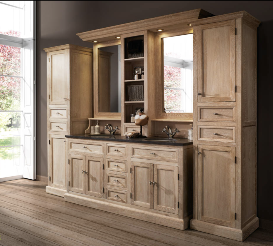 Deze klassiek landelijke stijl eiken kolomkast past bij het landelijke eiken badkamermeubel met 1 of 2 wastafels en natuursteen blad.