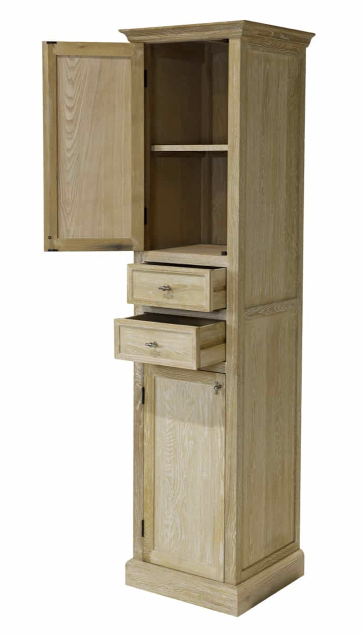 Mooie klassieke eiken kolomkast met 2 deuren en 2 laden voor uw landelijke badkamer. Je kan kiezen voor een eiken kolomkast links of rechts opendraaiend