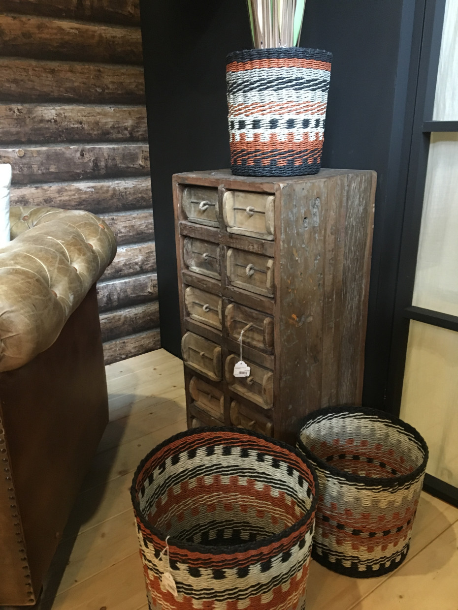 Deze commode kast is decoratief afgewerkt met touw als handgrepen voor de schuifladen