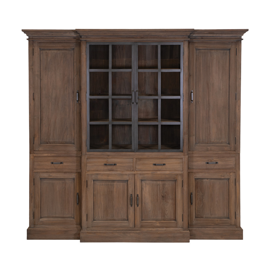 Louise is een klassiek landelijke vitrinekast met 4 deuren bovenaan, nl. 2 houten deuren en 2 glazen vitrinedeuren en is voorzien van 4 schuifladen.