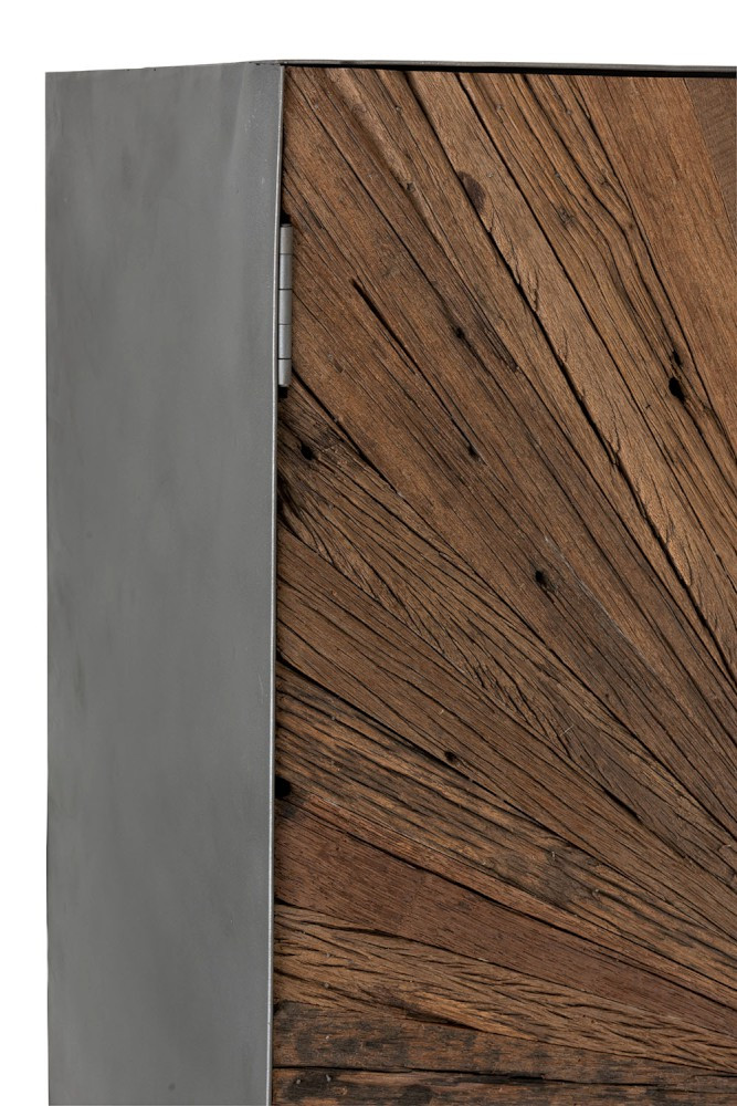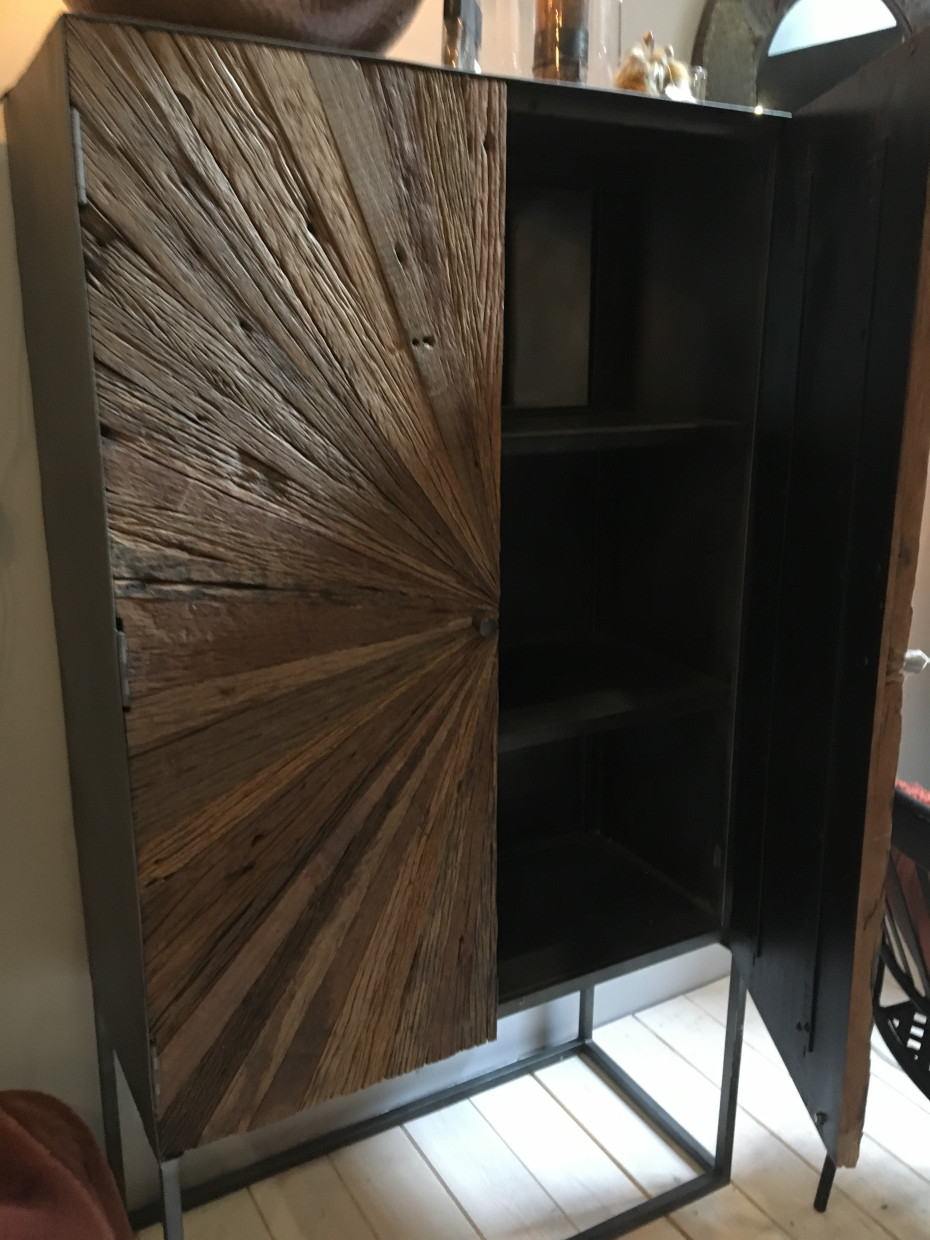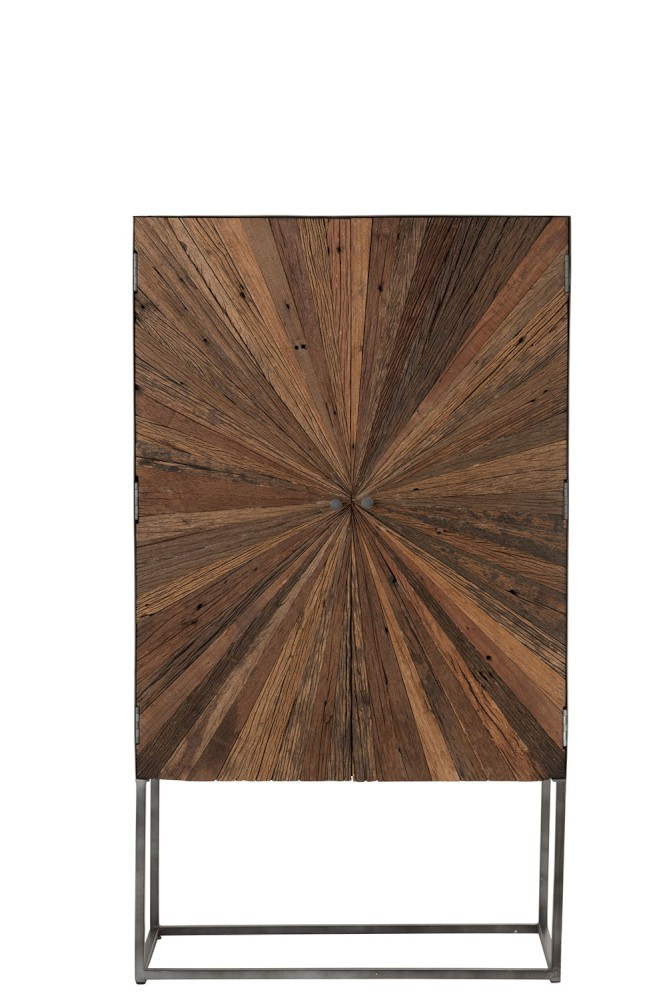 Landelijke houten barkast rechthoekig model met 2 deuren en grijze metalen voet. J-line kast Shanil 2 deuren hout/ijzer