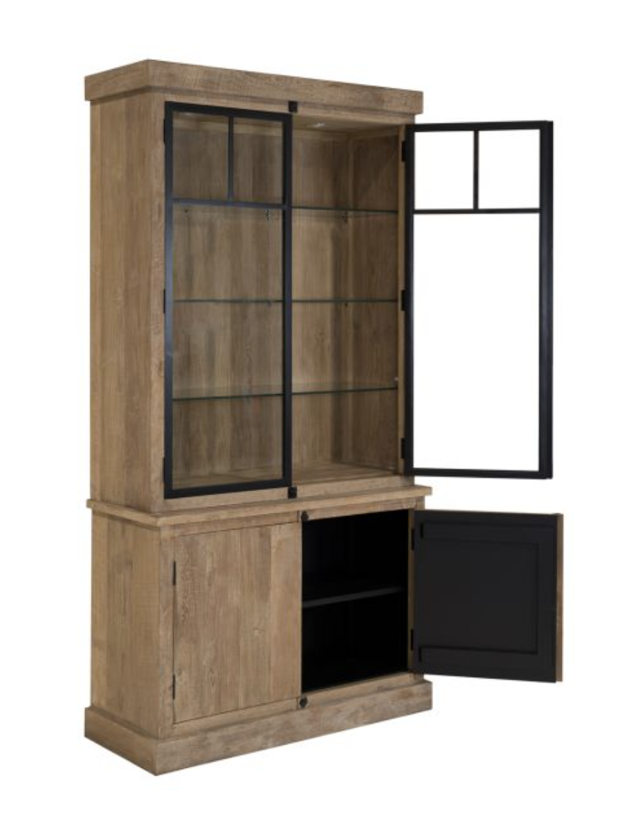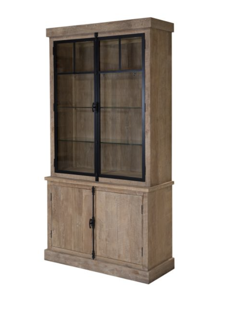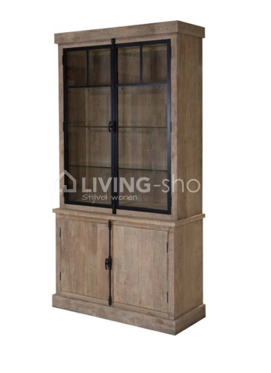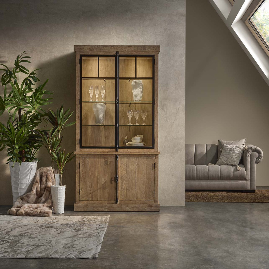 De landelijke 2-deurs vitrinekast is voorzien van geïntegreerde LED verlichting.