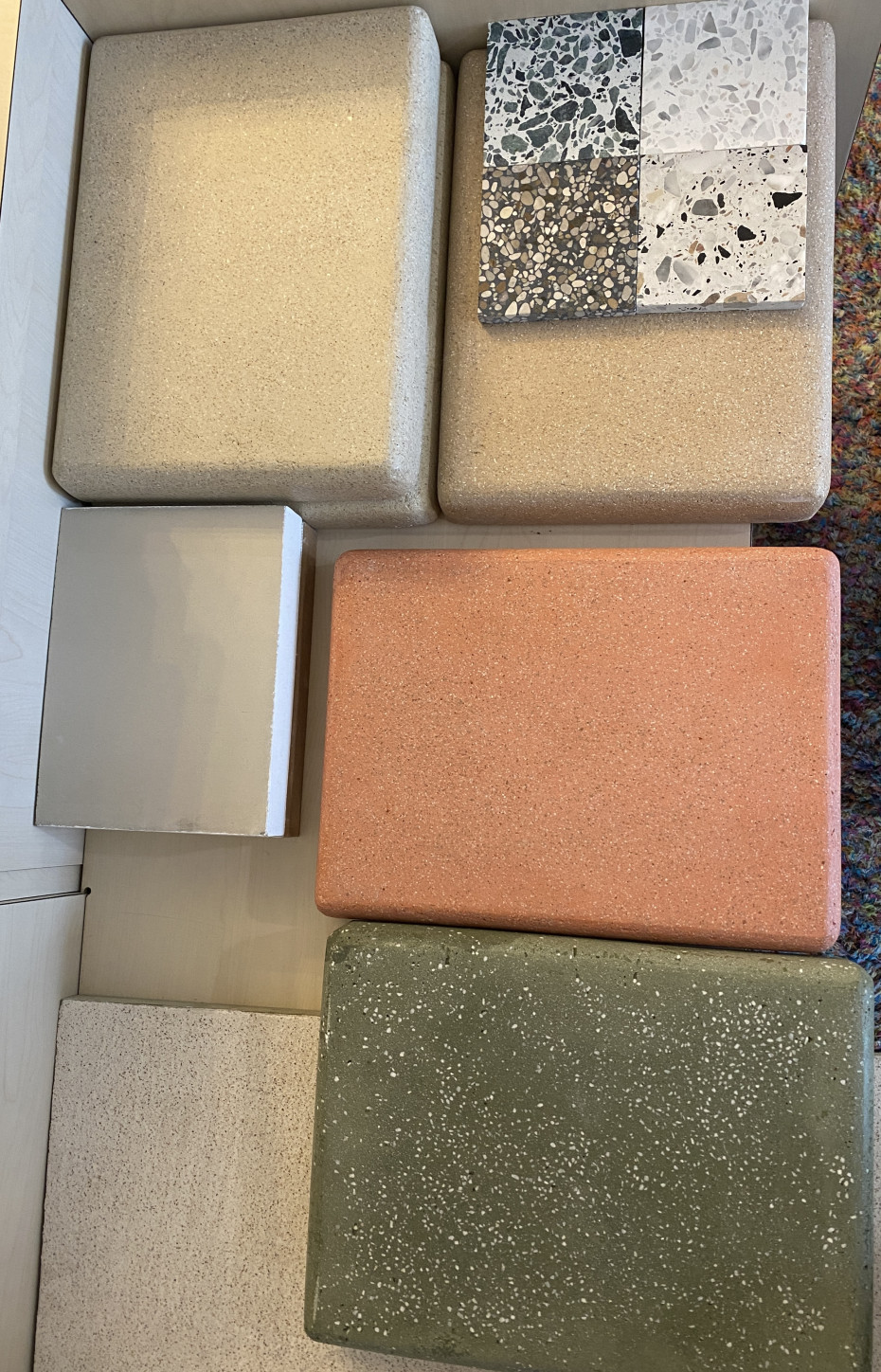 De Terrazzo en mortex tafels worden op maat gemaakt en zijn te kiezen uit diverse kleuren