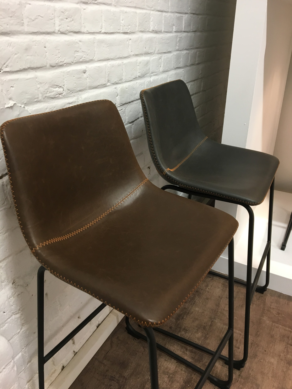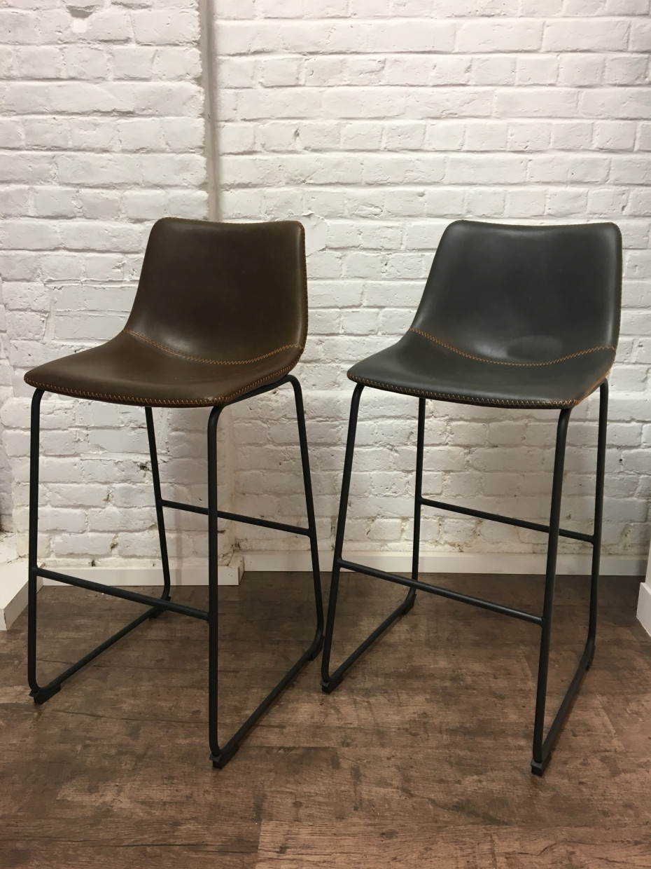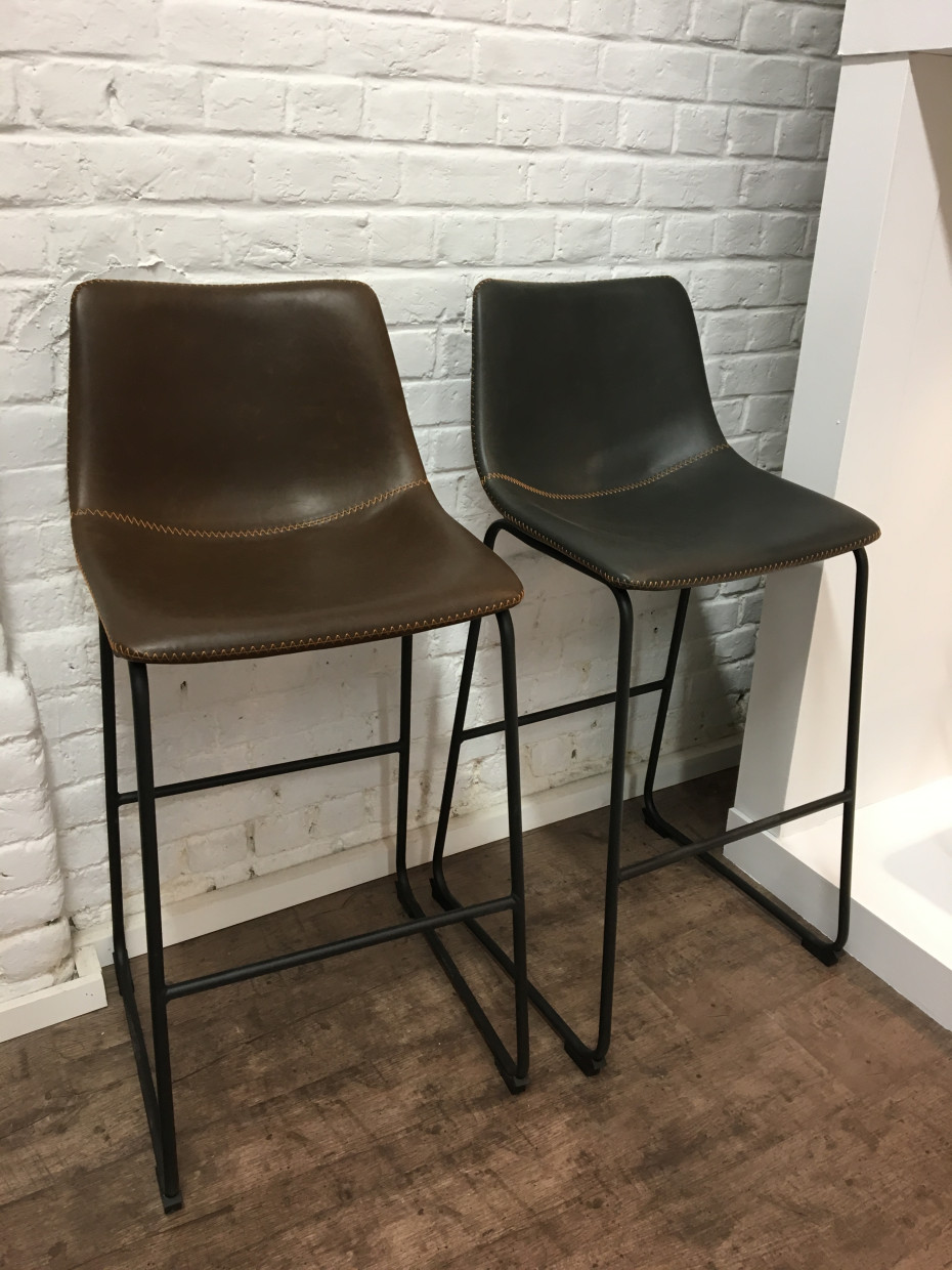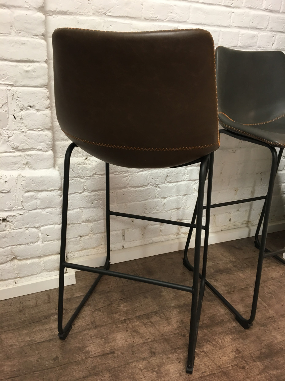 Deze industrieel landelijke barstoelen zijn ook verkrijgbaar in pu bruin en allebei de kleuren te bezichtigen op afspraak in de showroom.
