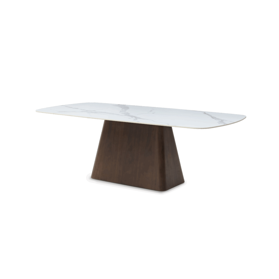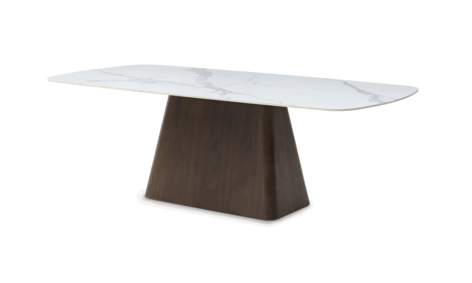 Deens Ovale dineertafel met keramisch tafelblad en walnoot veneer tafelvoet.