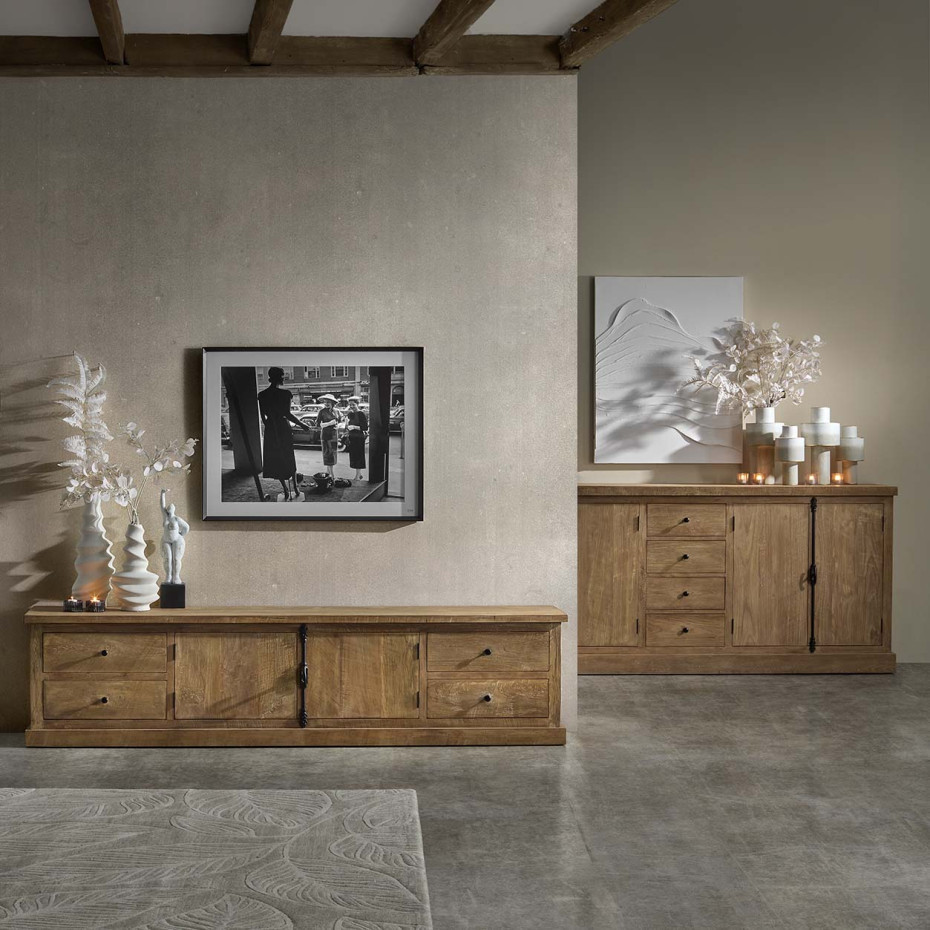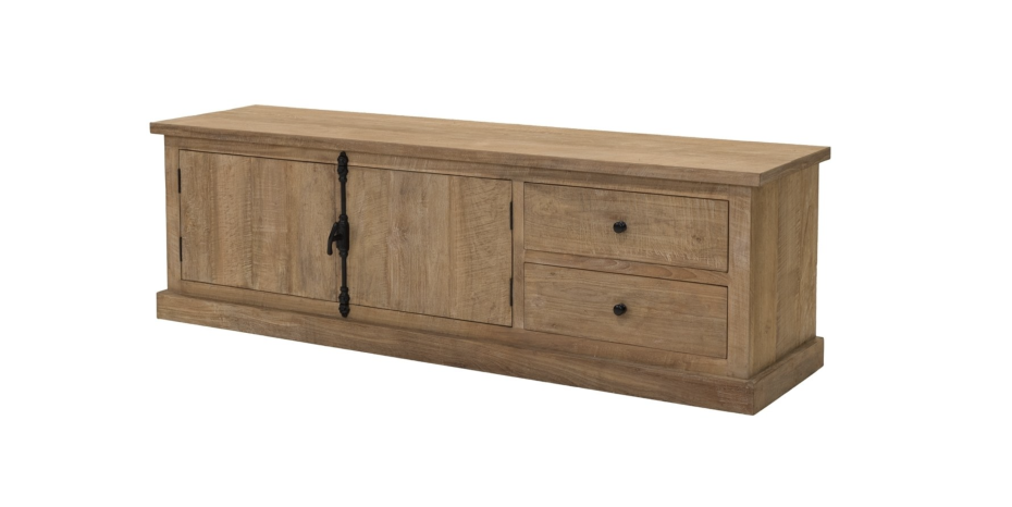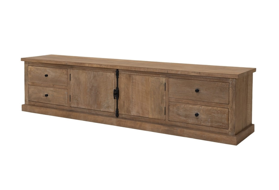 Landelijk Tv meubel met in het midden 2 deuren met zwart staafslot en 4 schuifladen met zwarte knop handgerepen
