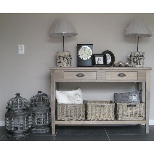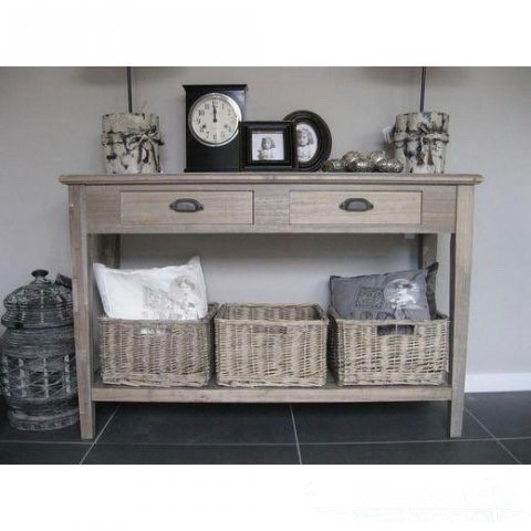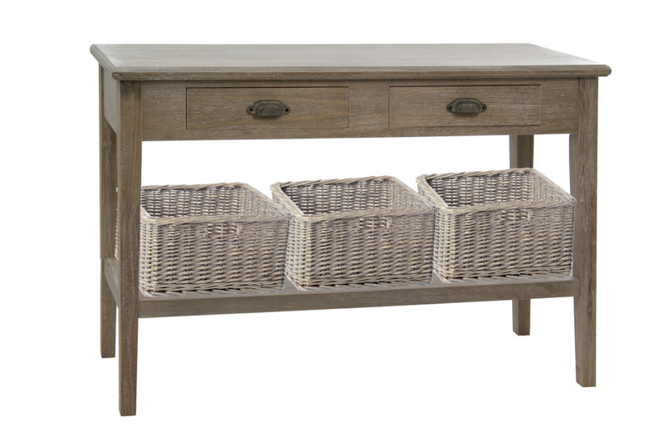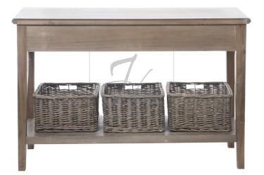 Landelijke stijl console met 3 laden en 3 manden en legplank onderaan. Rechthoekige wandtafel met landelijke stijl details, de 2 schuiven met cottage messing handgrepen en 3 rotan manden inclusief