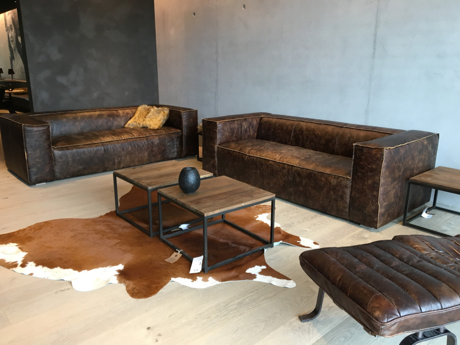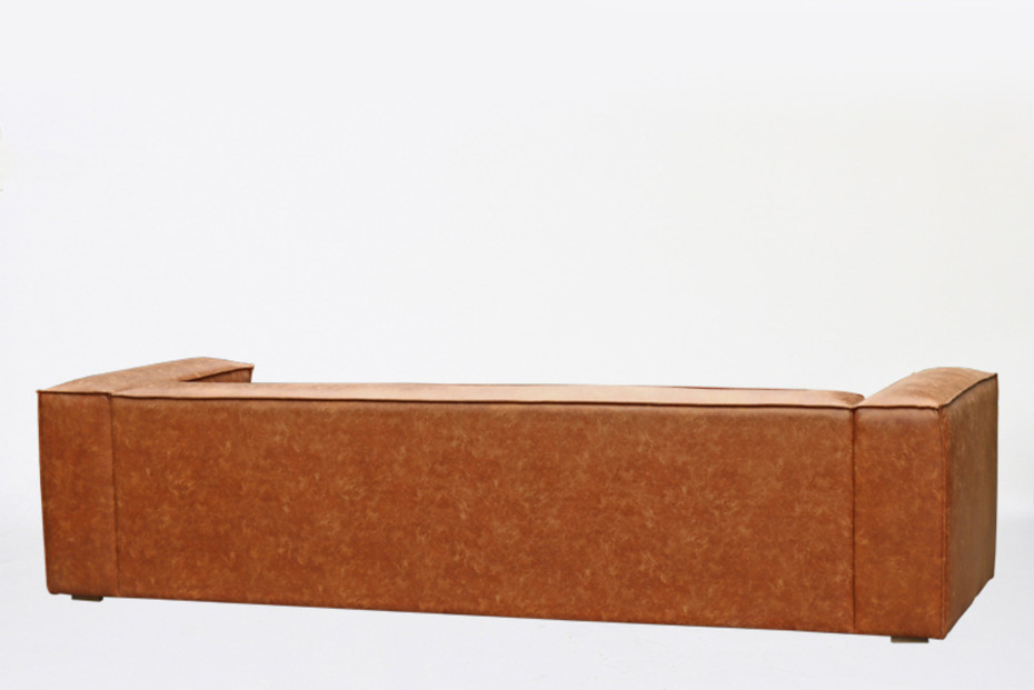 Robuuste sofa pu leder, stoere zitbank met geblokte armleuningen in het veelzijdige kleur bruin of camel. De zetels hebben een stoere vormgeving.