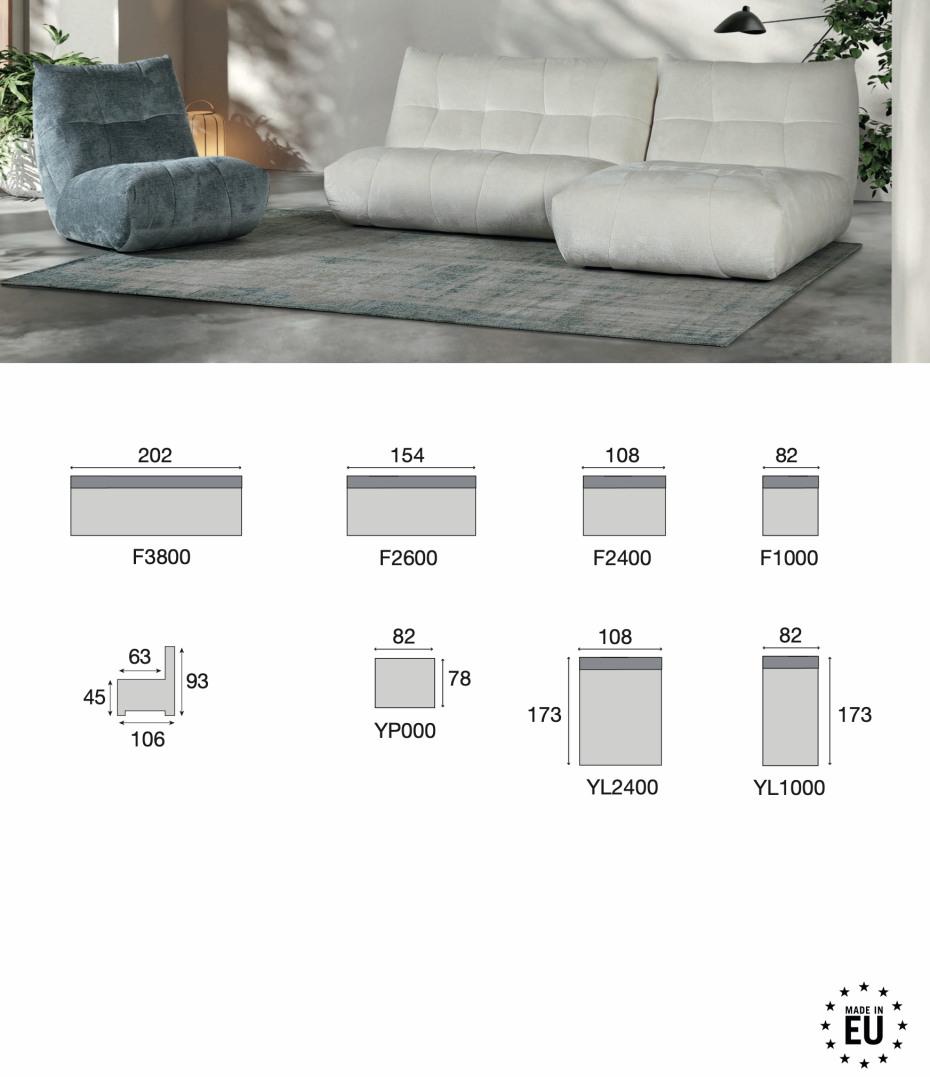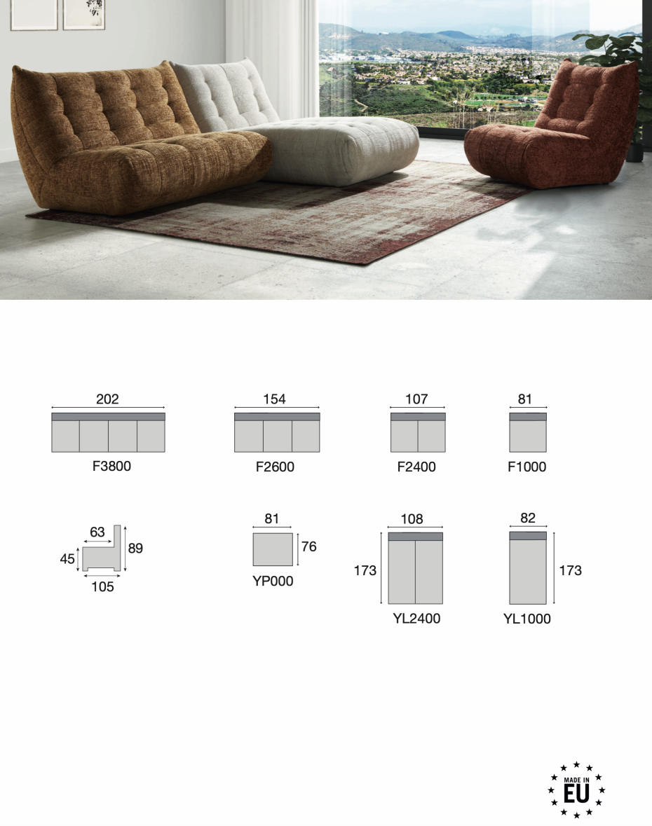 Je kan je design zitzak sofa kiezen als 1-zit, 2-zit of longchair, zie technische fiche