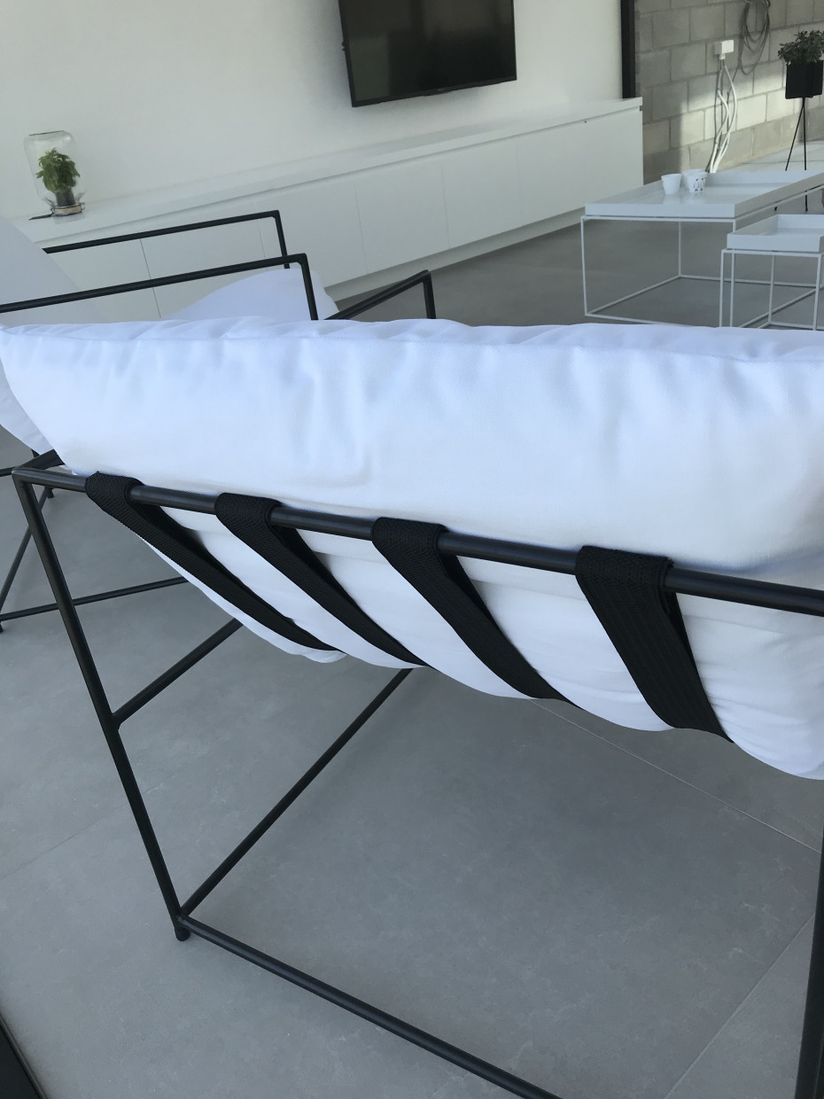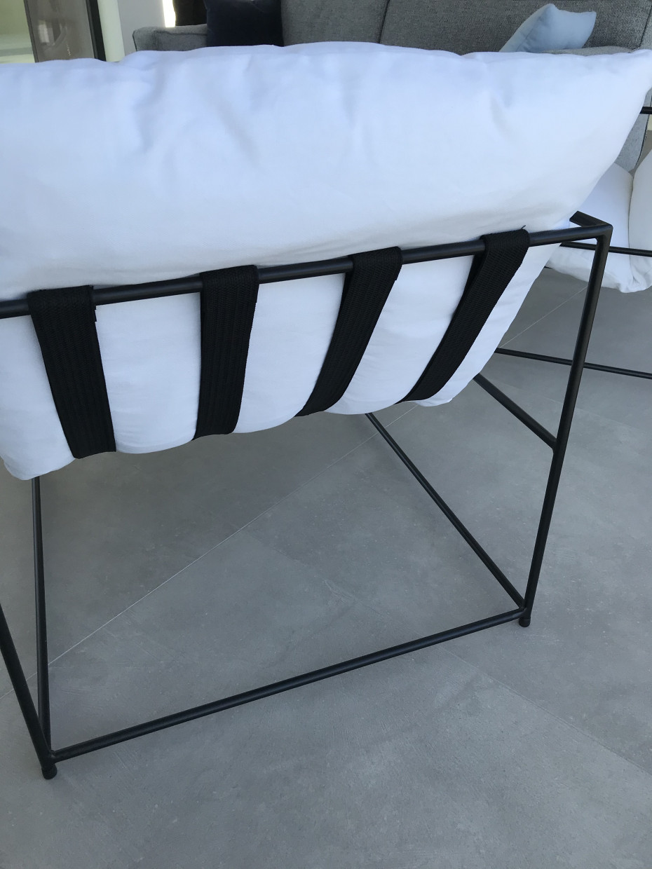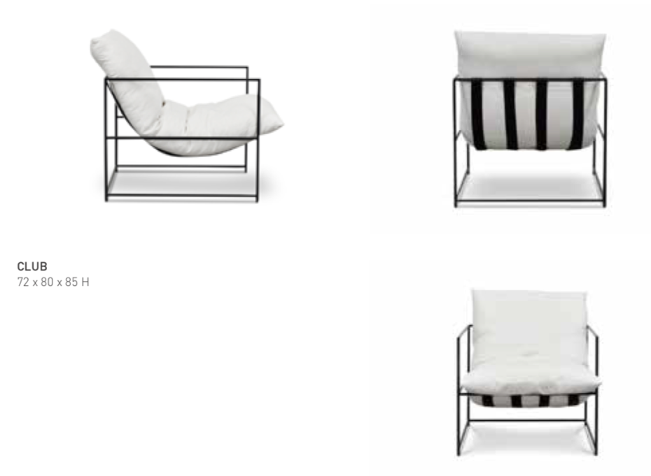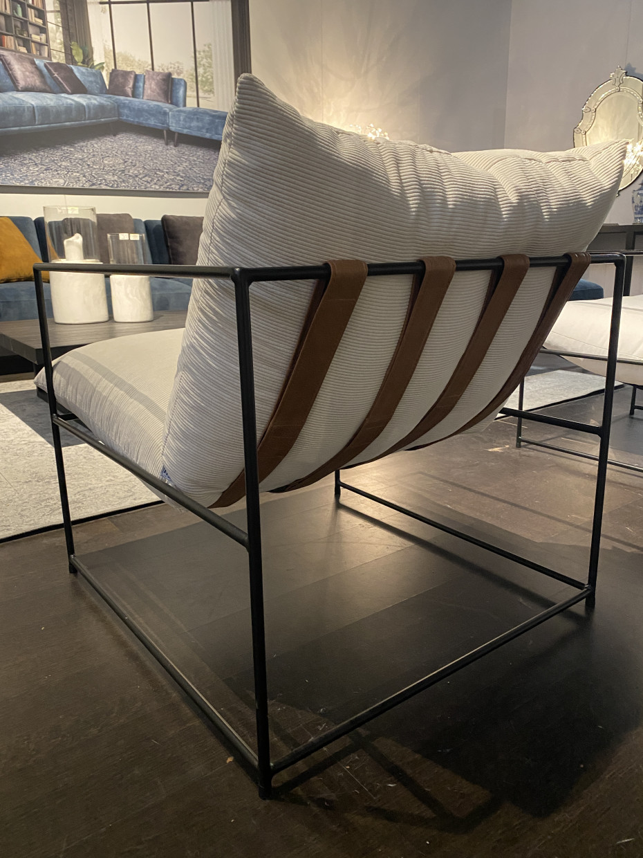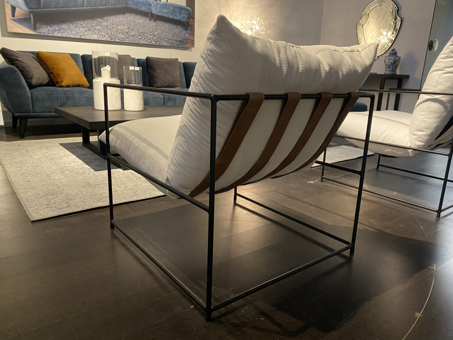 De klassevolle design clubzetel Amber is afgewerkt met afgerond metalen frame en armleuningen waardoor deze moderne fauteuil een aparte design look krijgt. De riemen waar het kussen op rust zijn altijd zwart (bruin lederen riemen zijn eveneens mogelijk mits meerpijs)