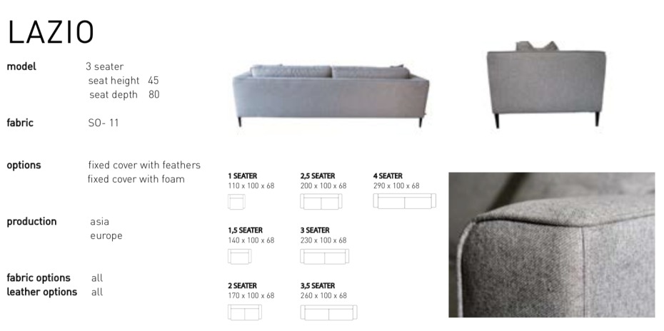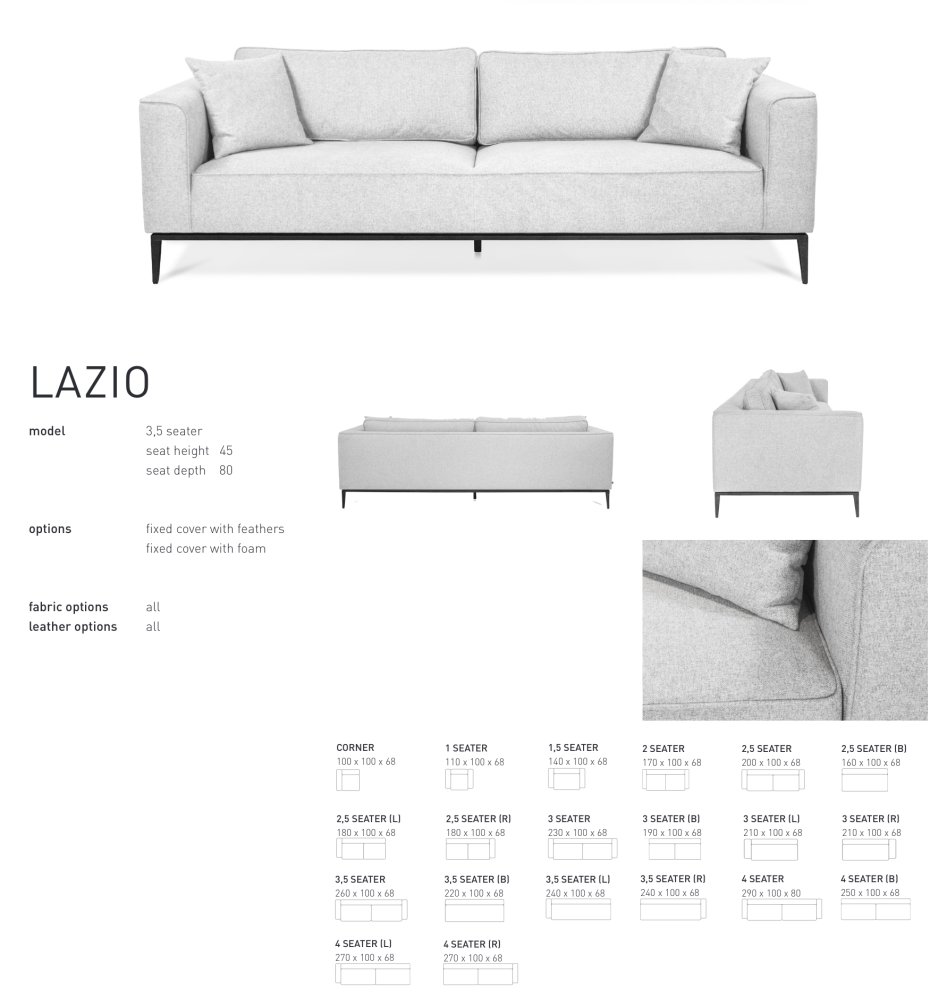 Sofa LAZIO is in verschillende uitvoeringen mogelijk te bestellen zoals 1-zit clubzetel, 1,5 zit, 2-zit, 2,5 zit, 3-zit , 3,5-zit en 4-zit.