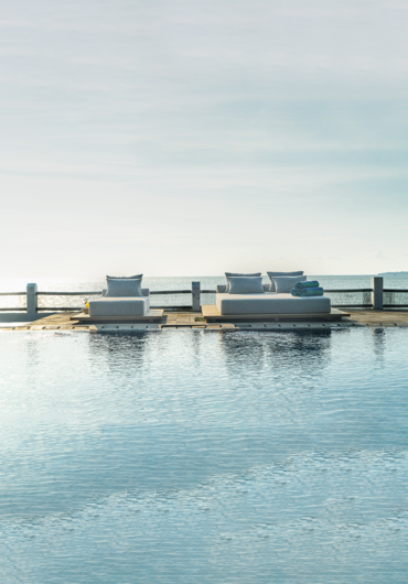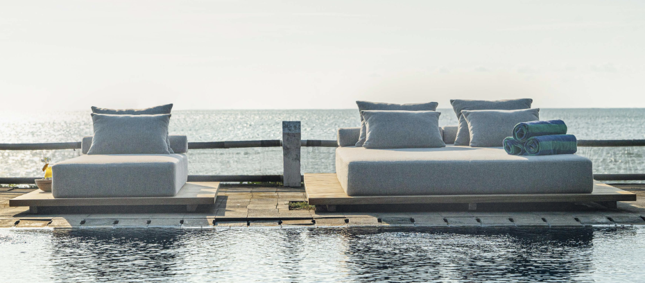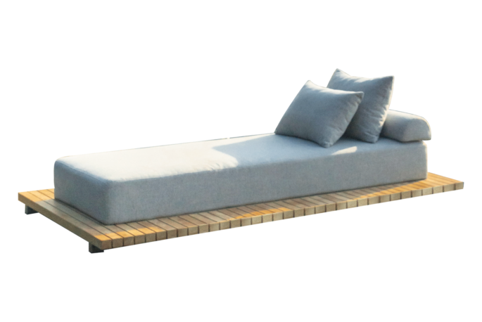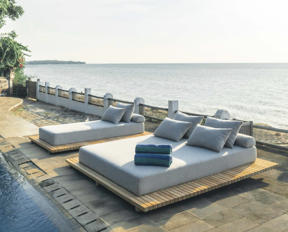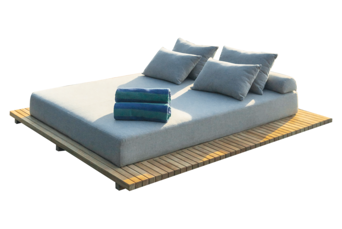 De Air couch ligbedden zijn ontworpen met een modern teak frame zwevend op voet en sunproof kussens gemaakt van duurzaam quick dry foam
