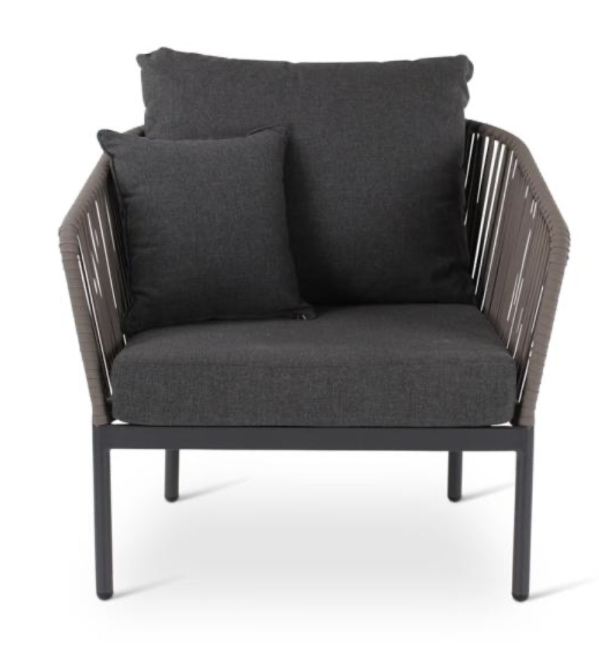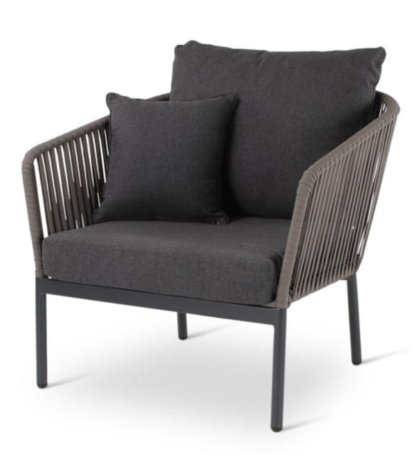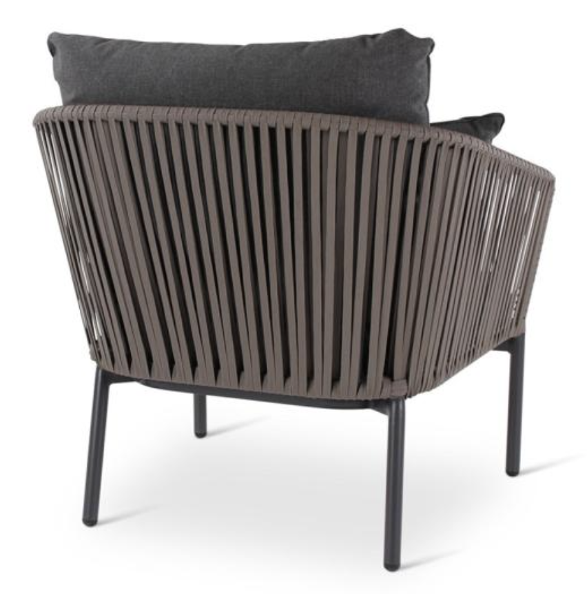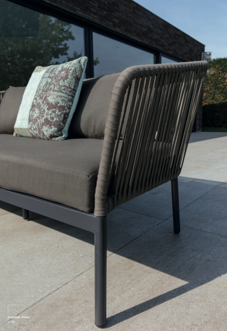 De zitting van de Clavo outdoor lounge collectie bestaat uit dik geweven textileen in taupe kleur. Het onderstel van duurzaam aluminium in antraciet van kleur. De Clavo lounge zitmeubelen zijn voorzien van grijze kussens.