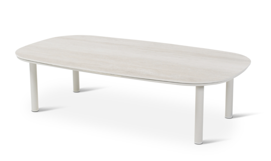 De LIV salontafel aluminiu sand meet 120x65xH21CM, weegt 15kg en heeft een tafelblad van steen