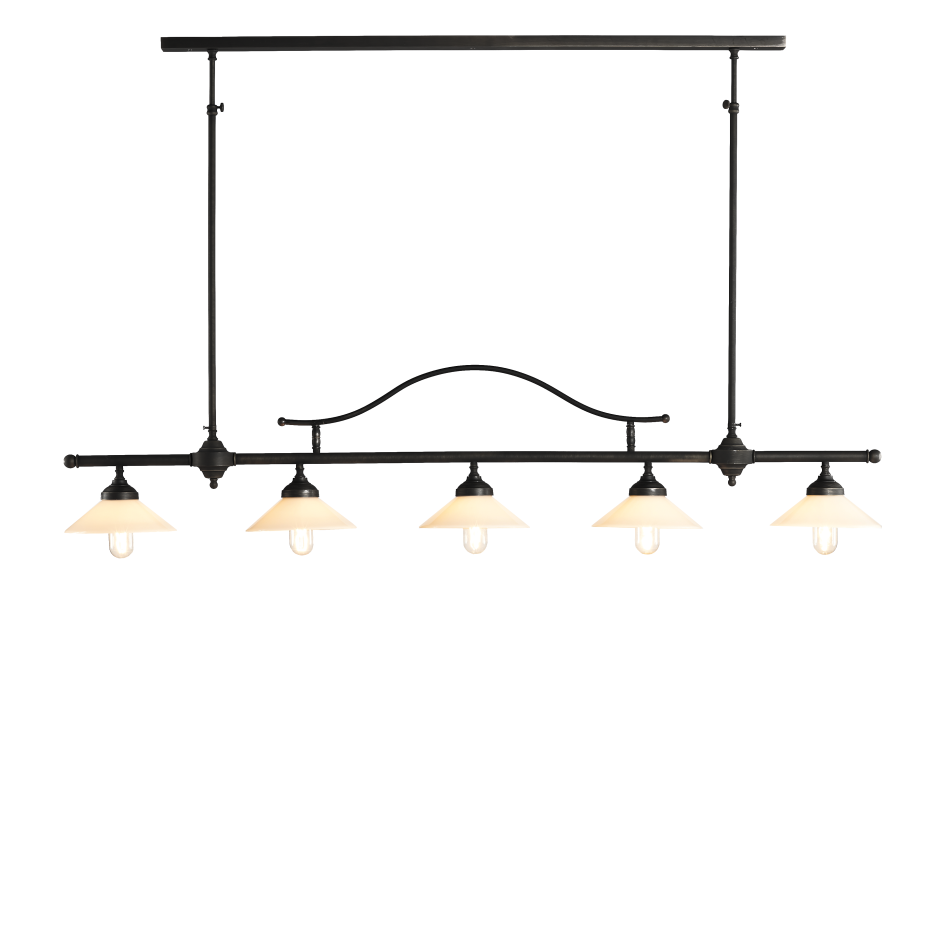 Landelijke luster Biliardo donkerbrons met 5 lichtpunten, incl 5 opaal melkglas lampenkapjes.