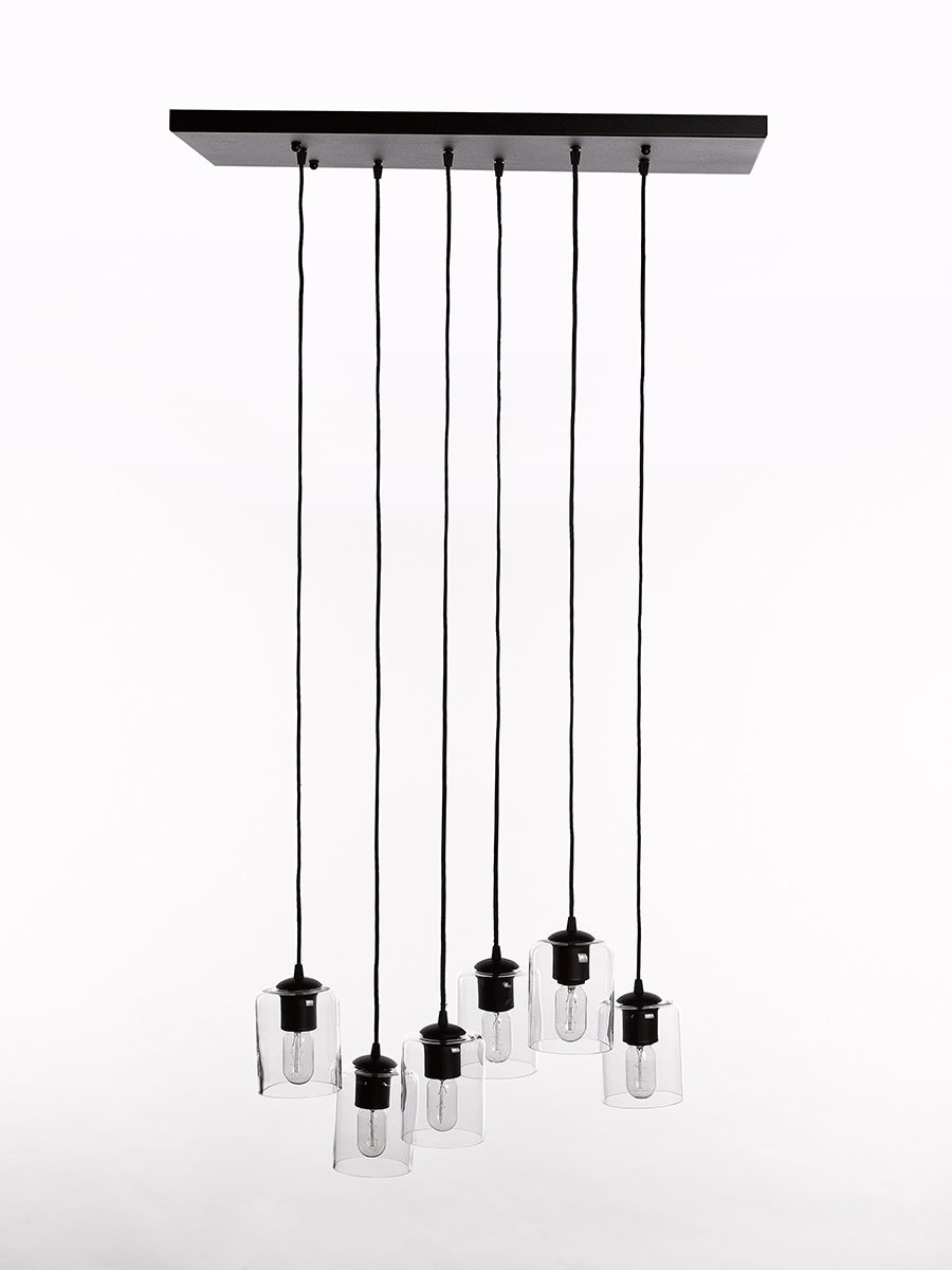 Afm lampenpendels Hoogte: min10-max115, plafond basis: L80xB40CMxH9CM. Excl 6xE27, 230-250V.