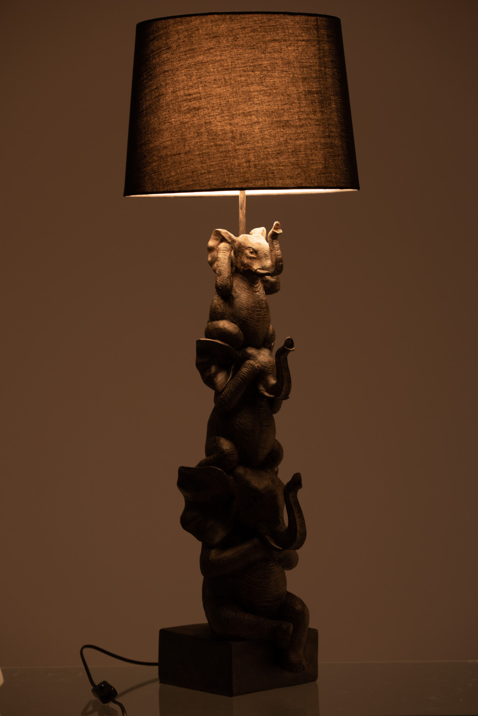 Lamphouder met 3 olifanten horen zien en zwijgen van poly bruin met ronde zwarte cotton lampenkap