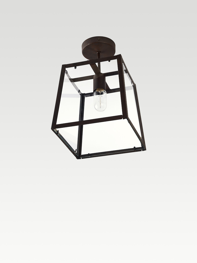 Plafondlamp Quadro met glazen wanden en roest metalen frame en plafondbevestiging